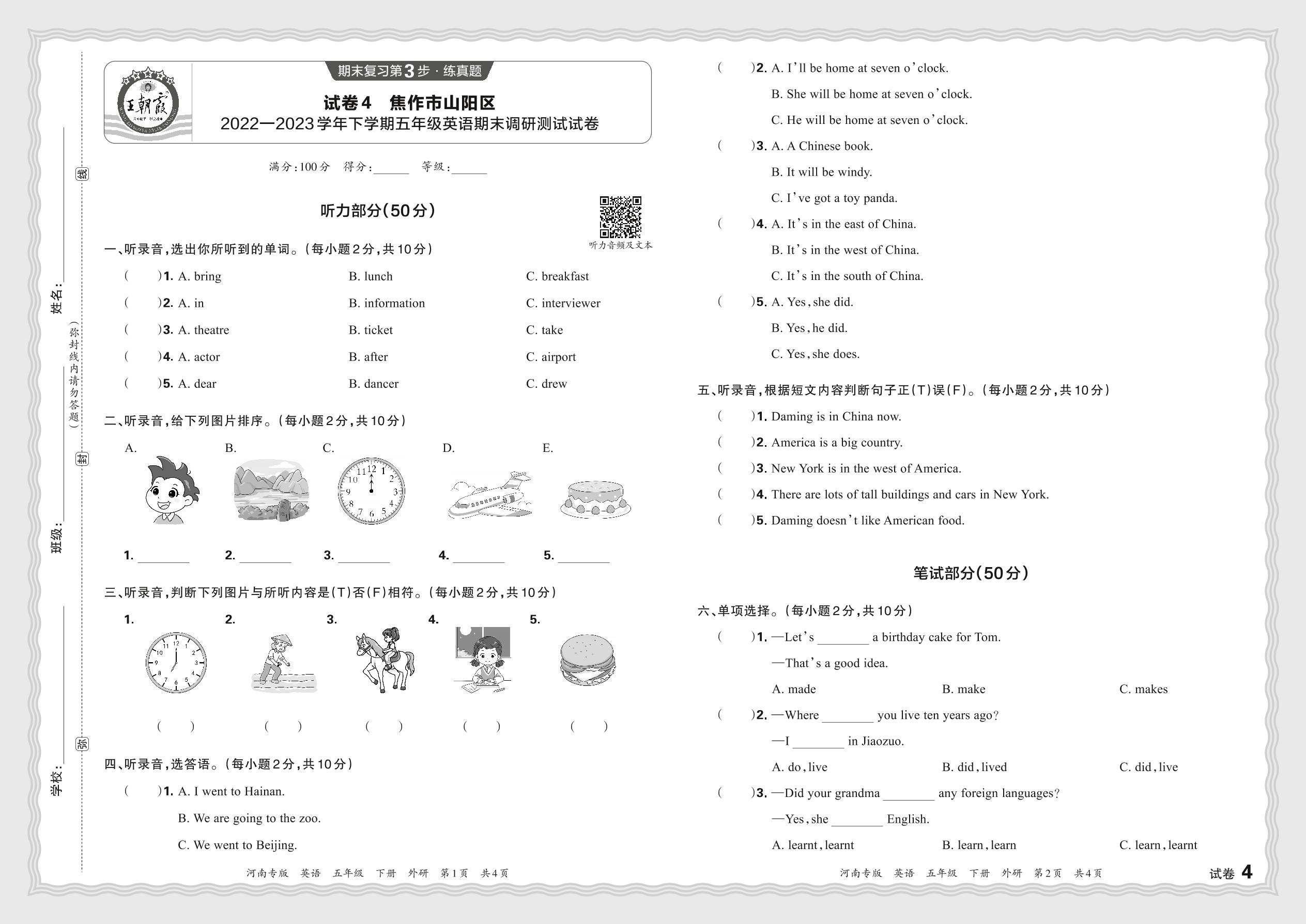 河南省焦作市山阳区2022—2023学年(下)五年级英语期末调研测试试卷(外研版)【4】