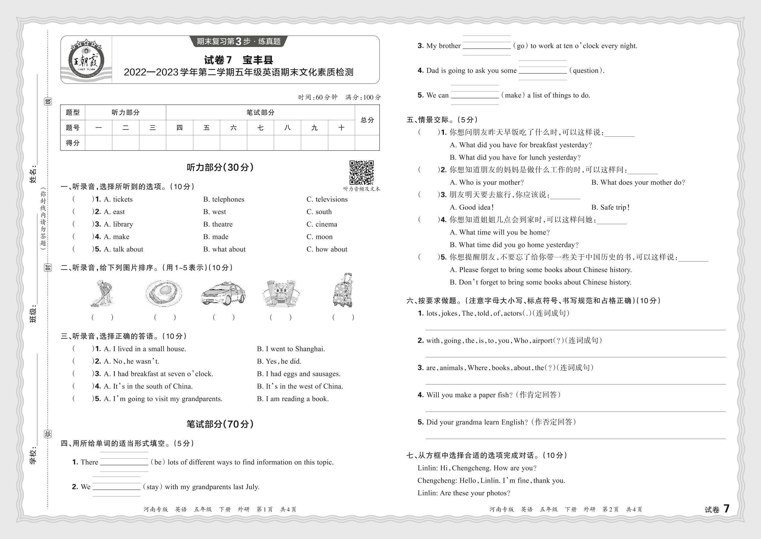 五年级英语外研版(三起始)下册期末卷