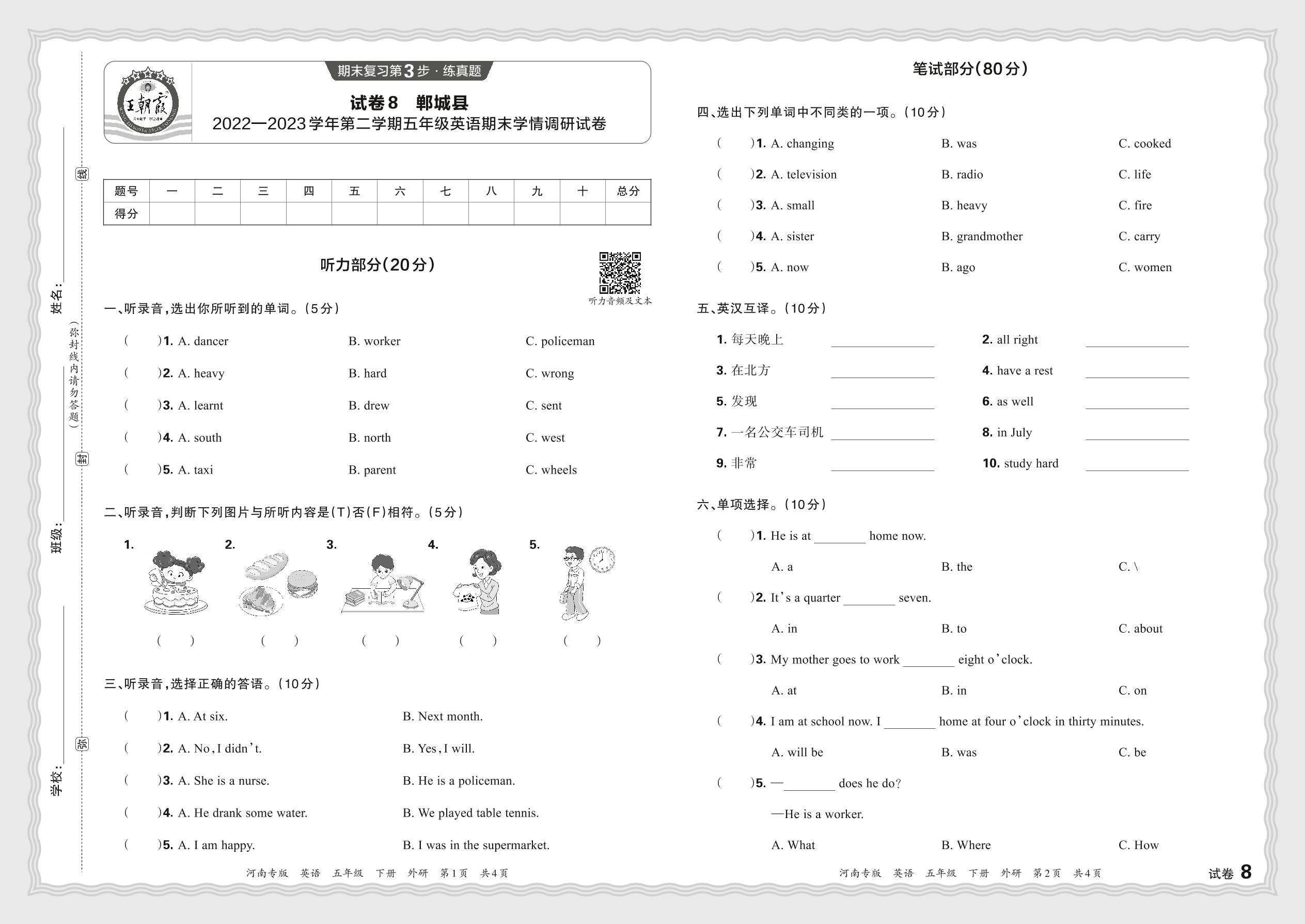 河南省周口市郸城县2022—2023学年第二学期五年级英语期末学情调研试卷(外研版)【8】