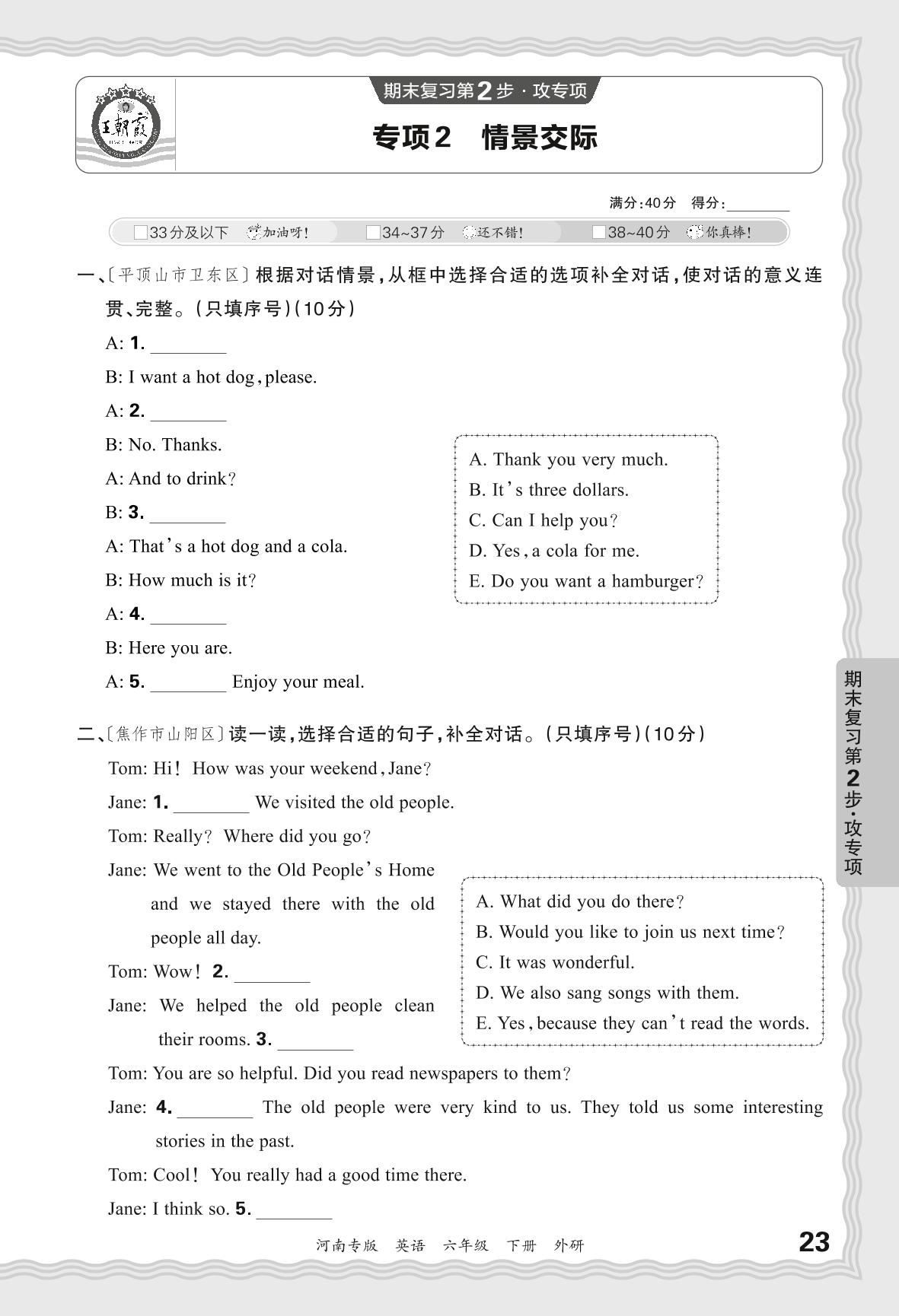 2024春下册六年级英语外研版 期末专项卷河南版·情景交际