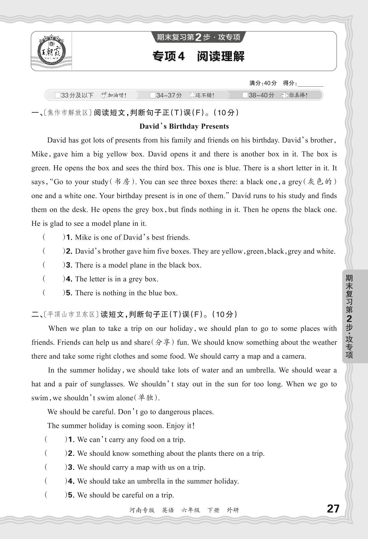 2024春下册六年级英语外研版 期末专项卷河南版·阅读理解