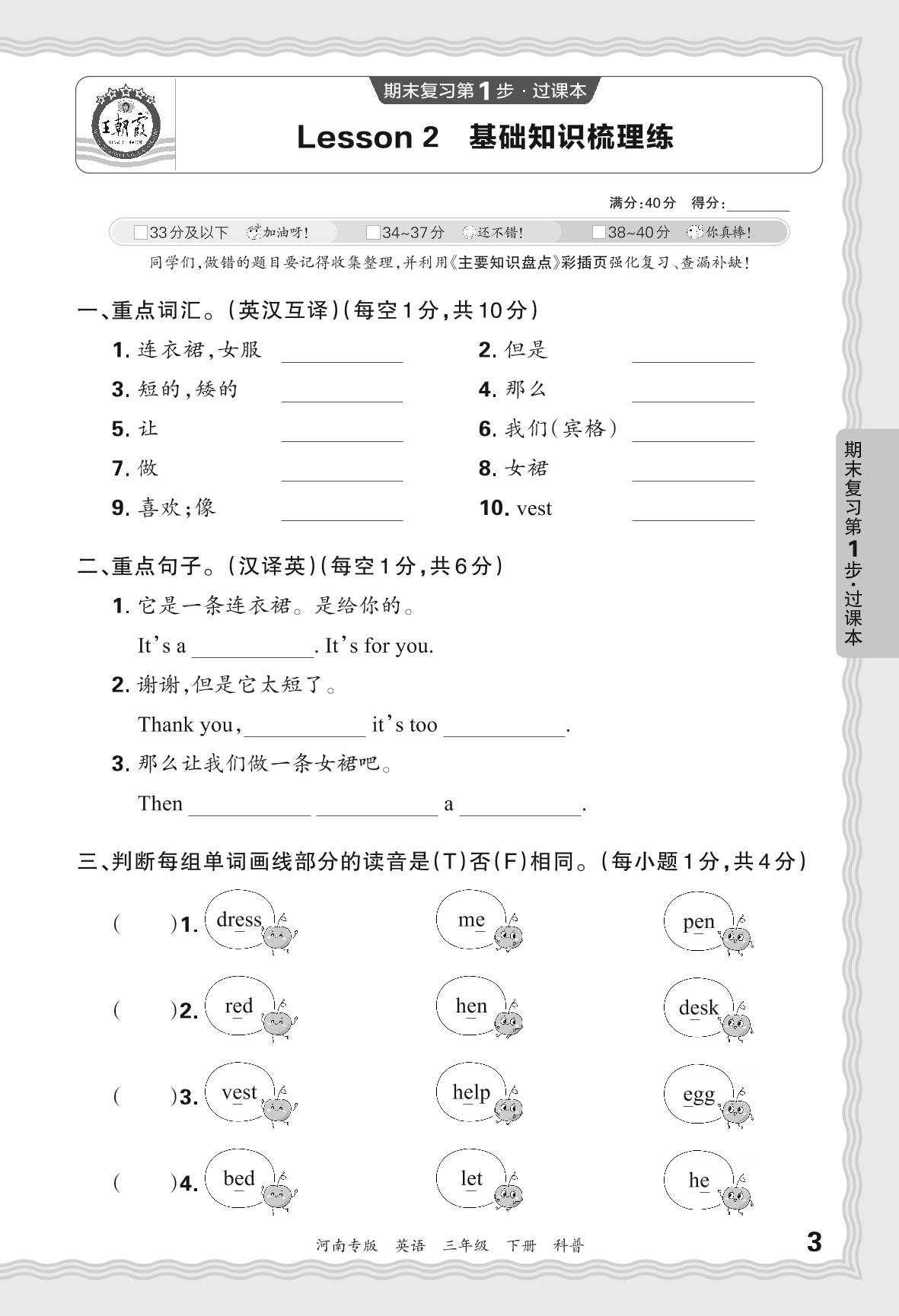 2024春下册三年级英语科普版 期末过课本河南版·Lesson 2 基础知识梳理练