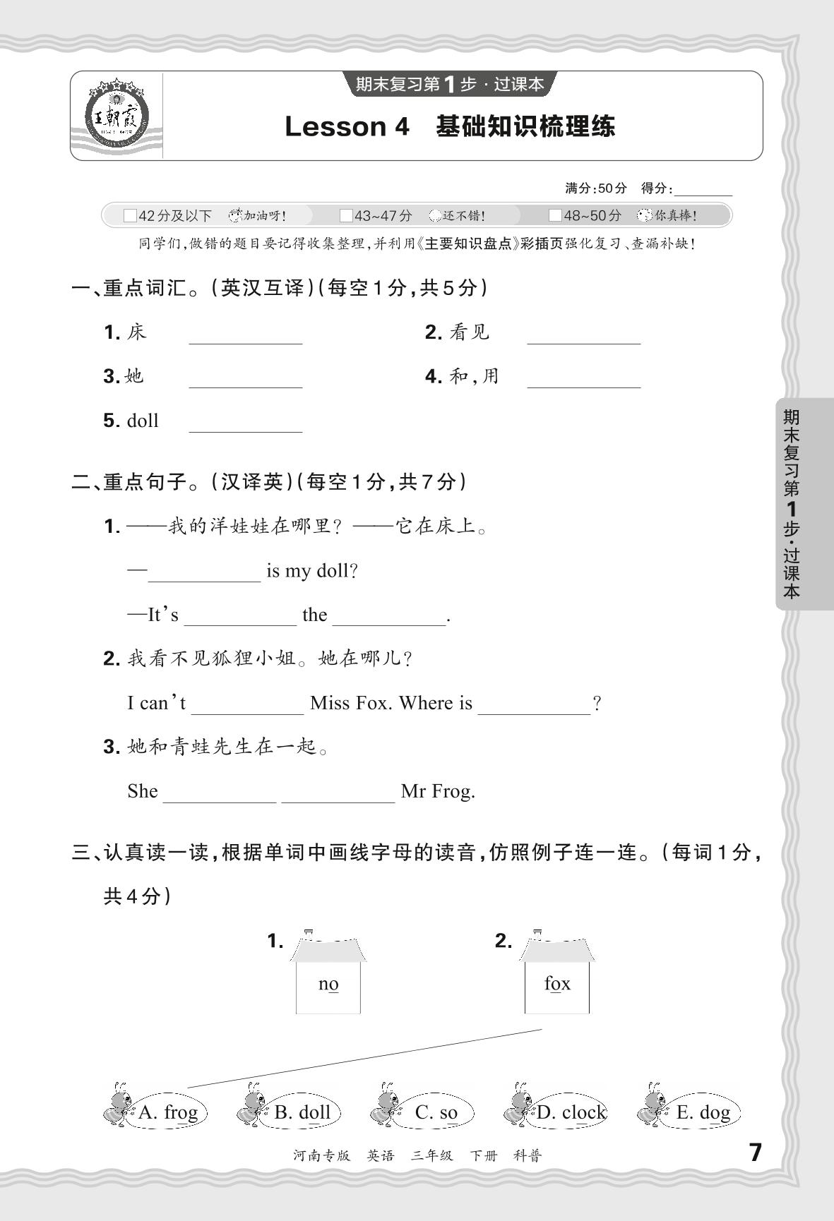 2024春下册三年级英语科普版 期末过课本河南版·Lesson 4 基础知识梳理练