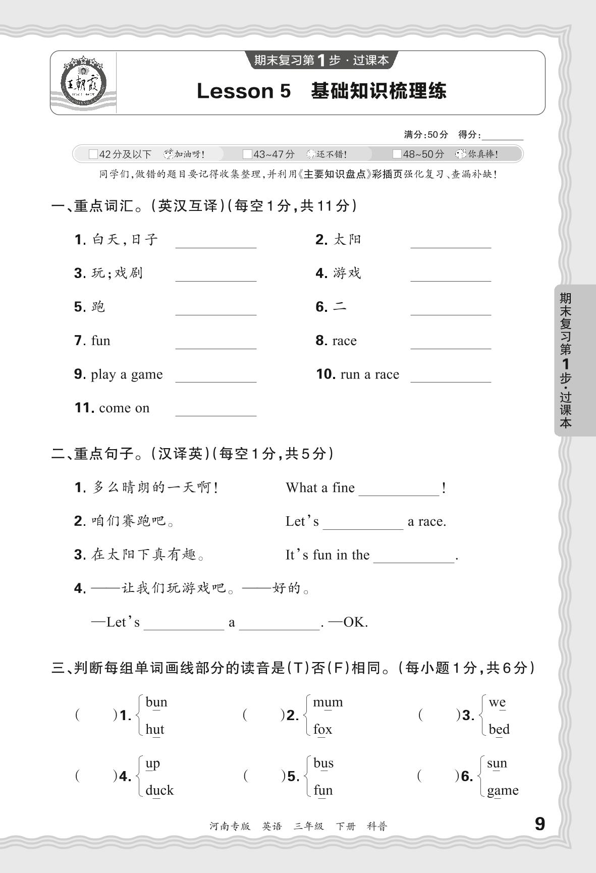 2024春下册三年级英语科普版 期末过课本河南版·Lesson 5 基础知识梳理练