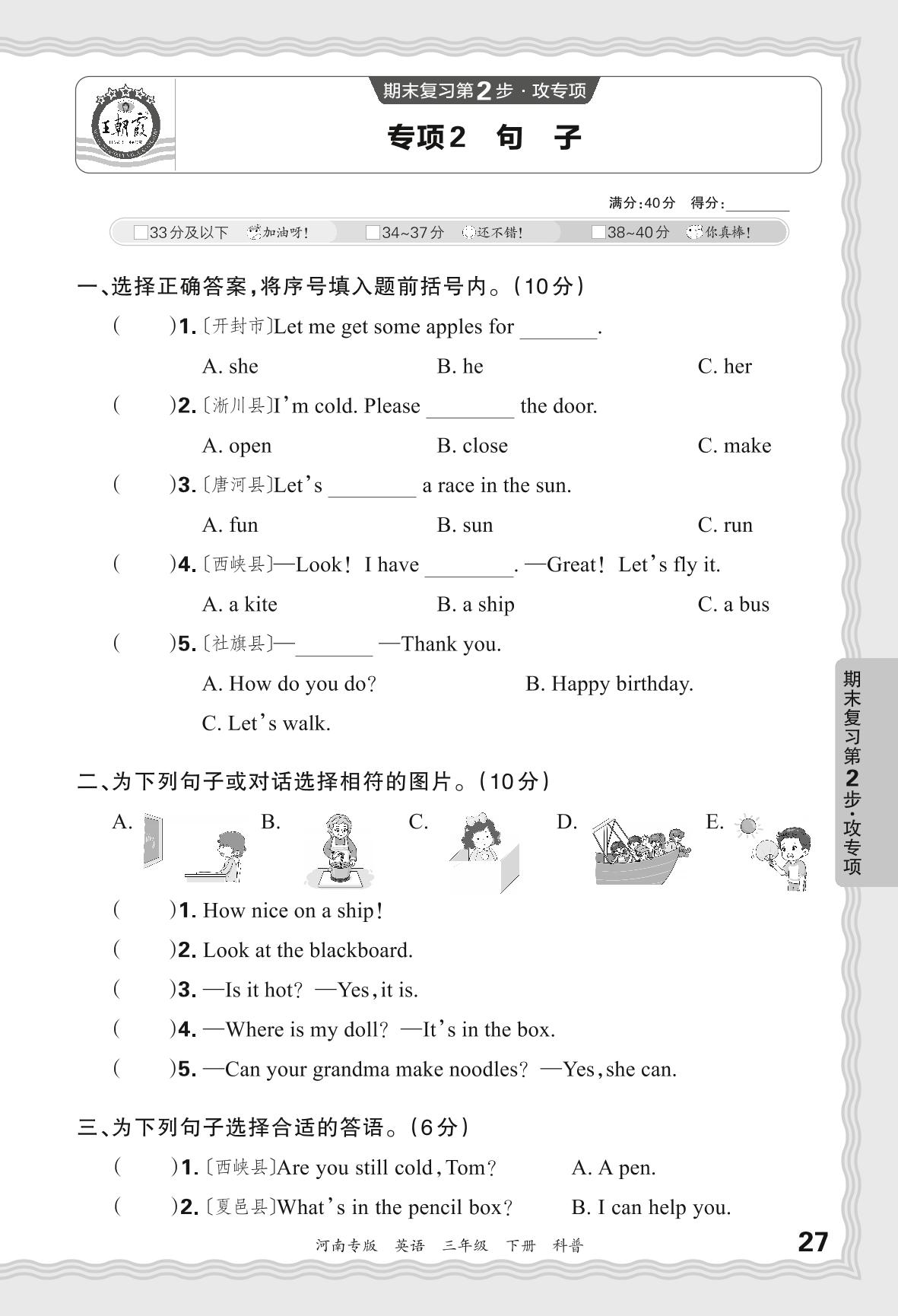 2024春下册三年级英语科普版 期末专项卷河南版·句子