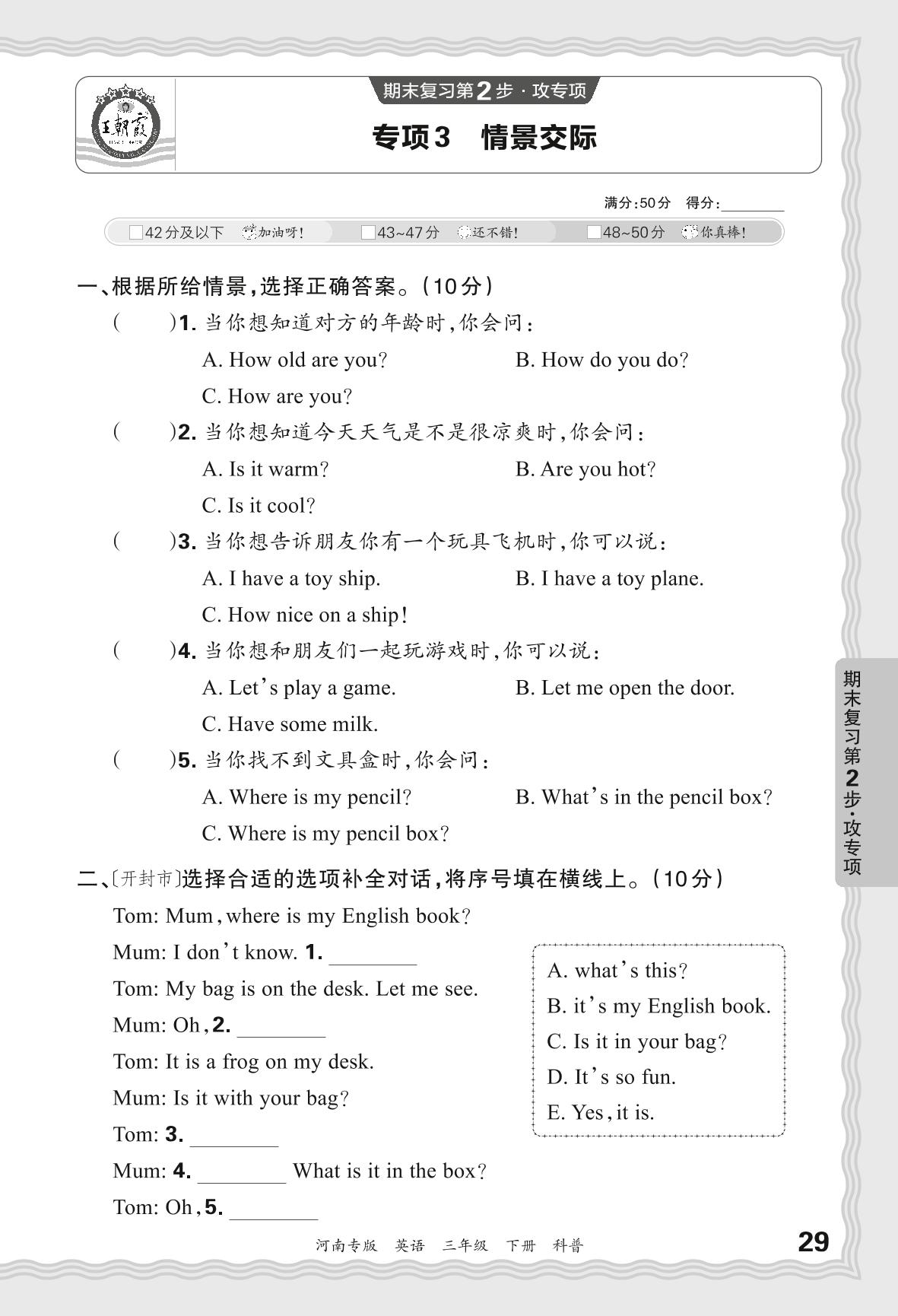 2024春下册三年级英语科普版 期末专项卷河南版·情景交际