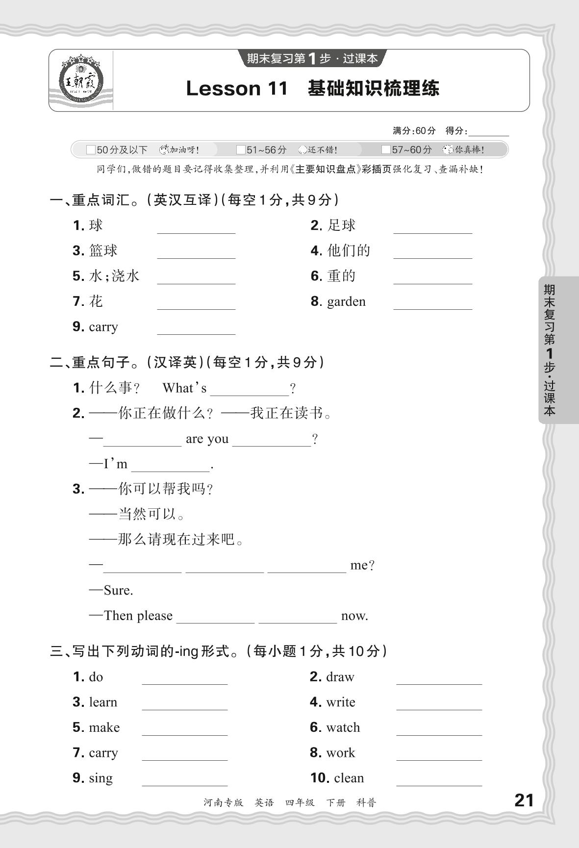 2024春下册四年级英语科普版 期末过课本河南版·Lesson 11 基础知识梳理练