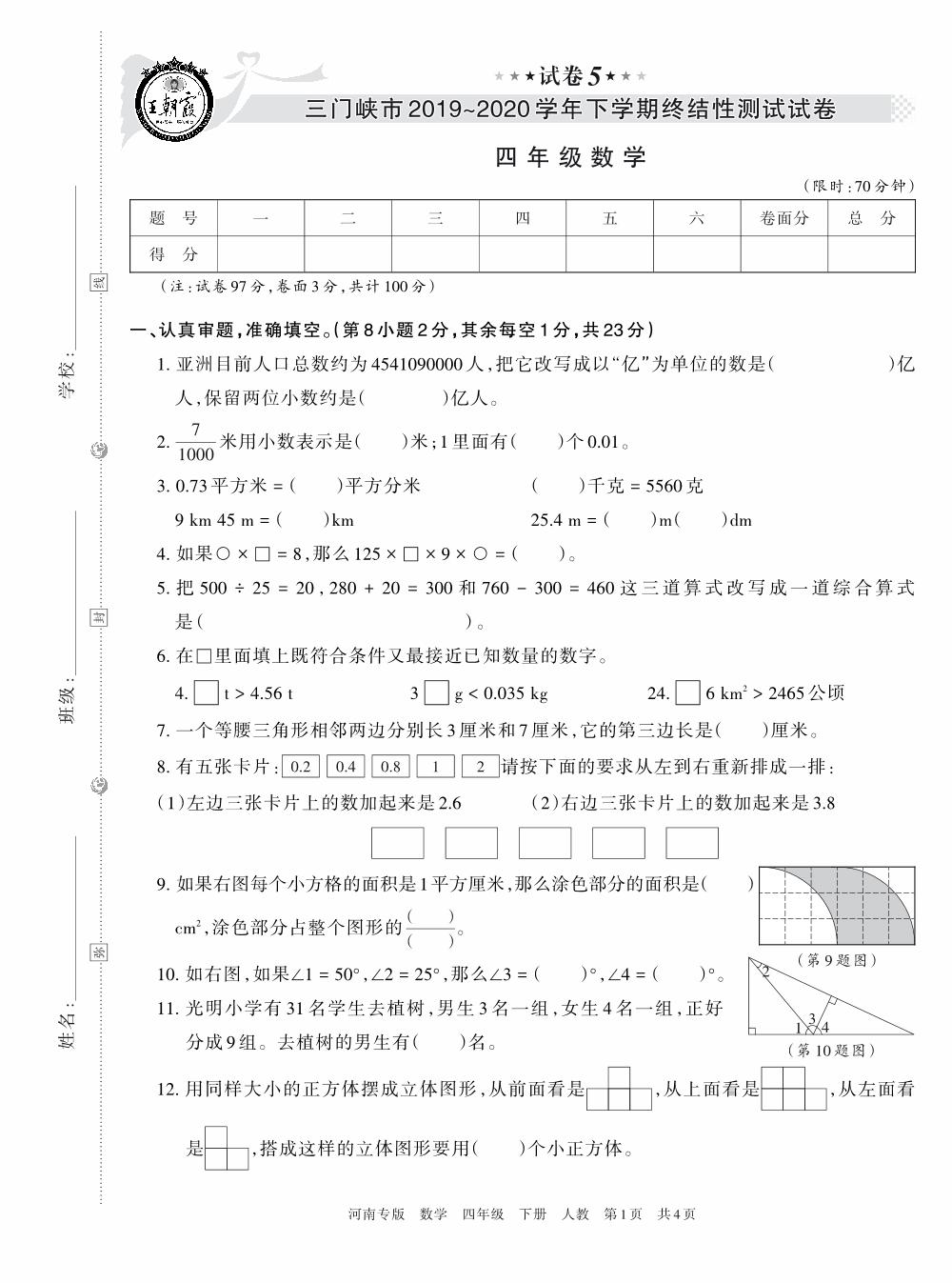 2019-2020学年第二学期三门峡市四年级数学试卷(人教版)_R210804135526【5】