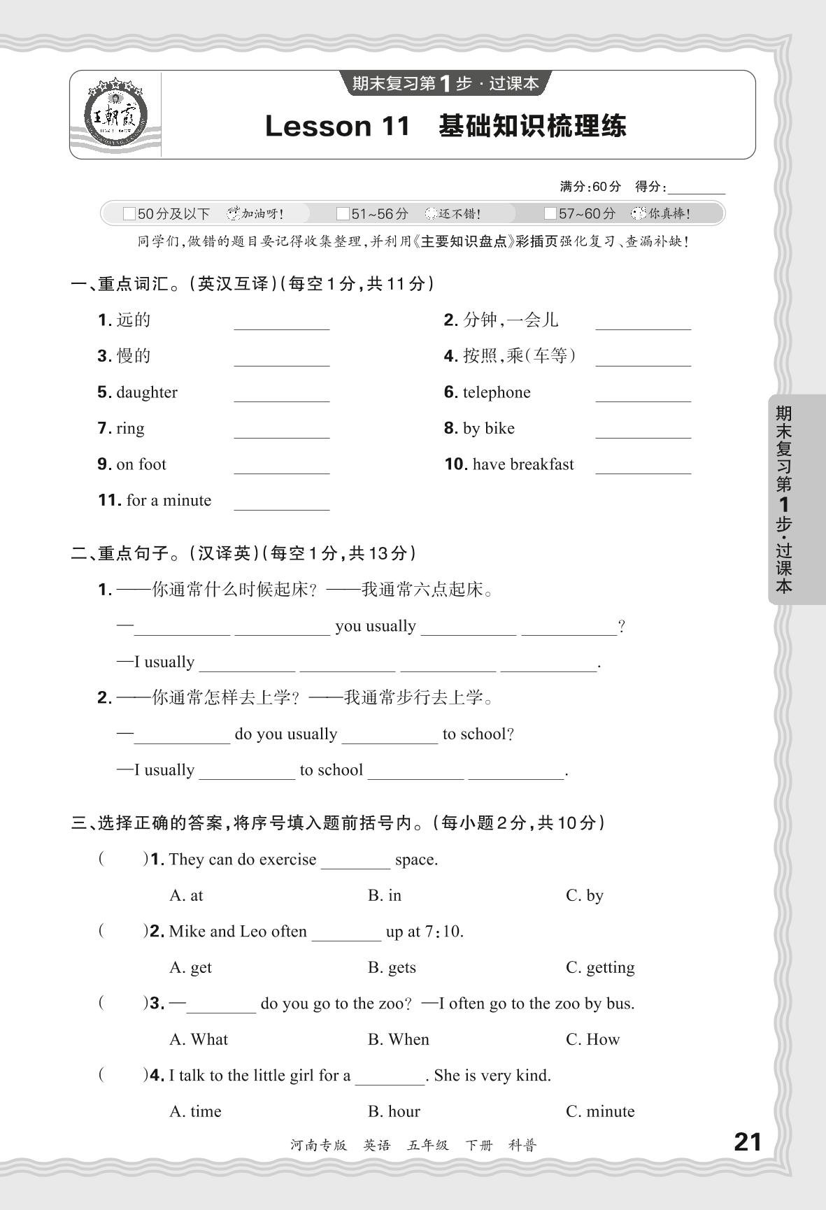 2024春下册五年级英语科普版 期末过课本河南版·Lesson 11 基础知识梳理练