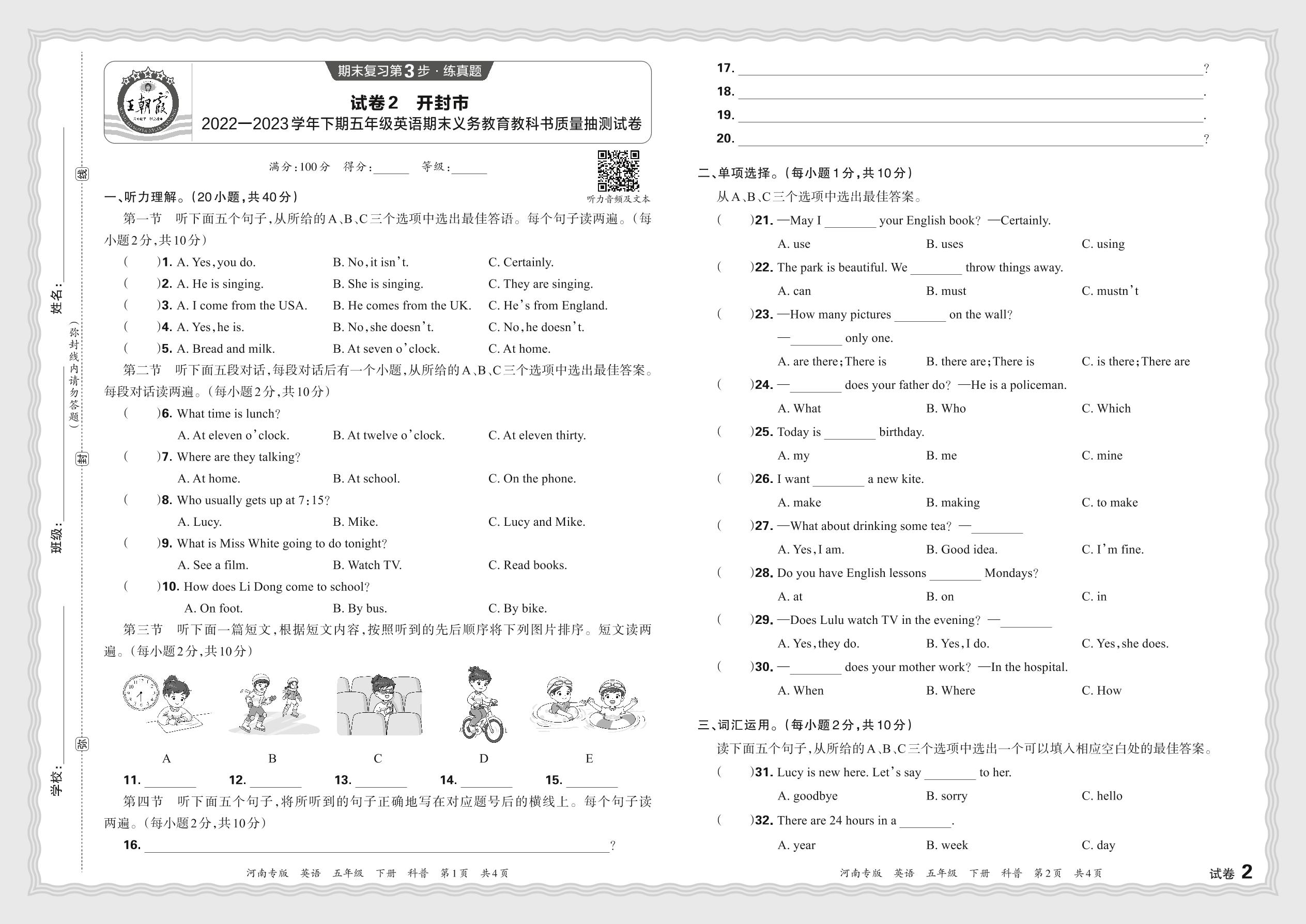 河南省开封市2022—2023学年下期五年级英语期末义务教育教科书质量抽测试卷 (科普版)【2】