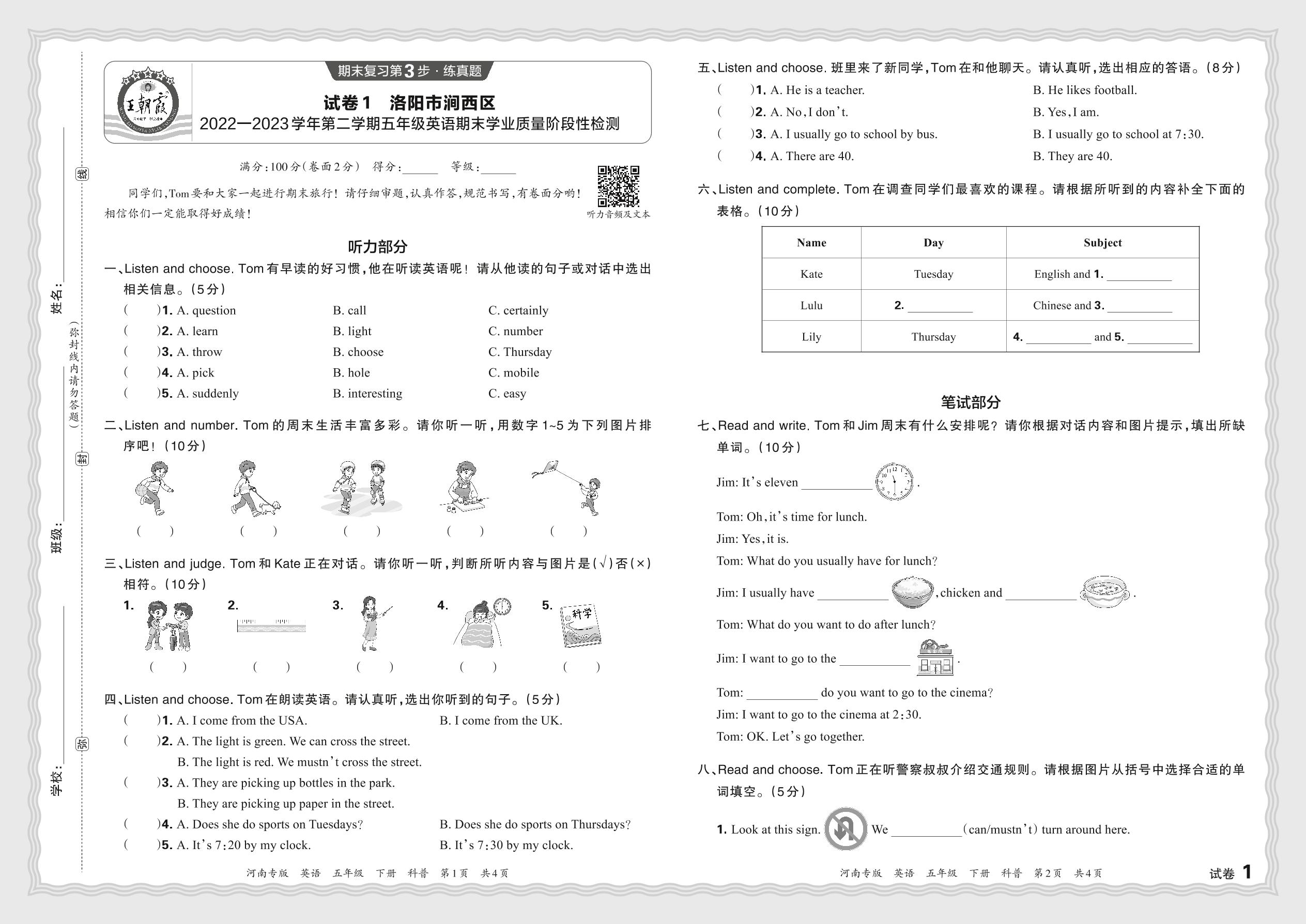 河南省洛阳市涧西区2022—2023学年第二学期五年级英语期末学业质量阶段性检测(科普版)【1】