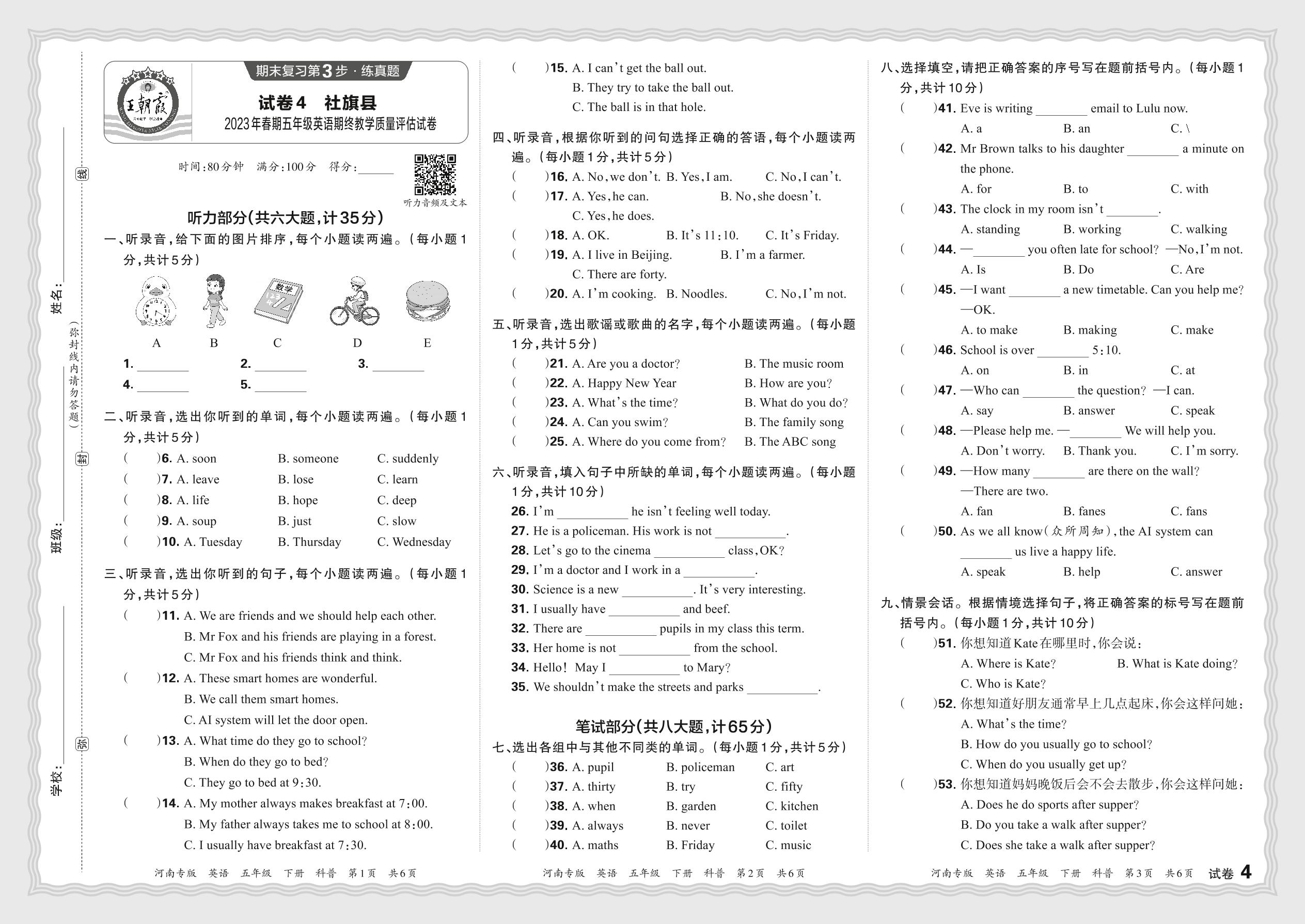 河南省南阳市社旗县2023年春期五年级英语期终教学质量评估试卷(科普版)【4】