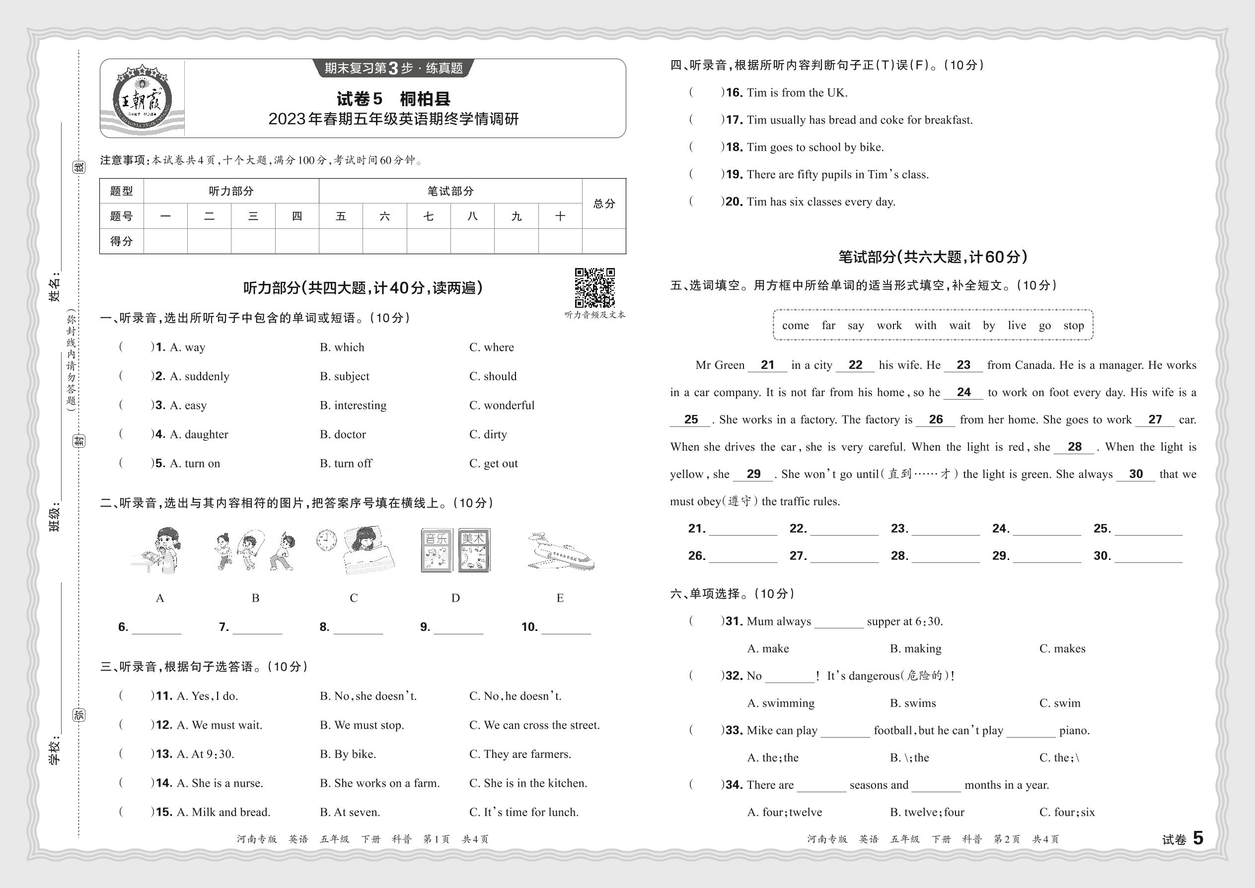河南省南阳市桐柏县2023年春期五年级英语期终学情调研(科普版)【5】