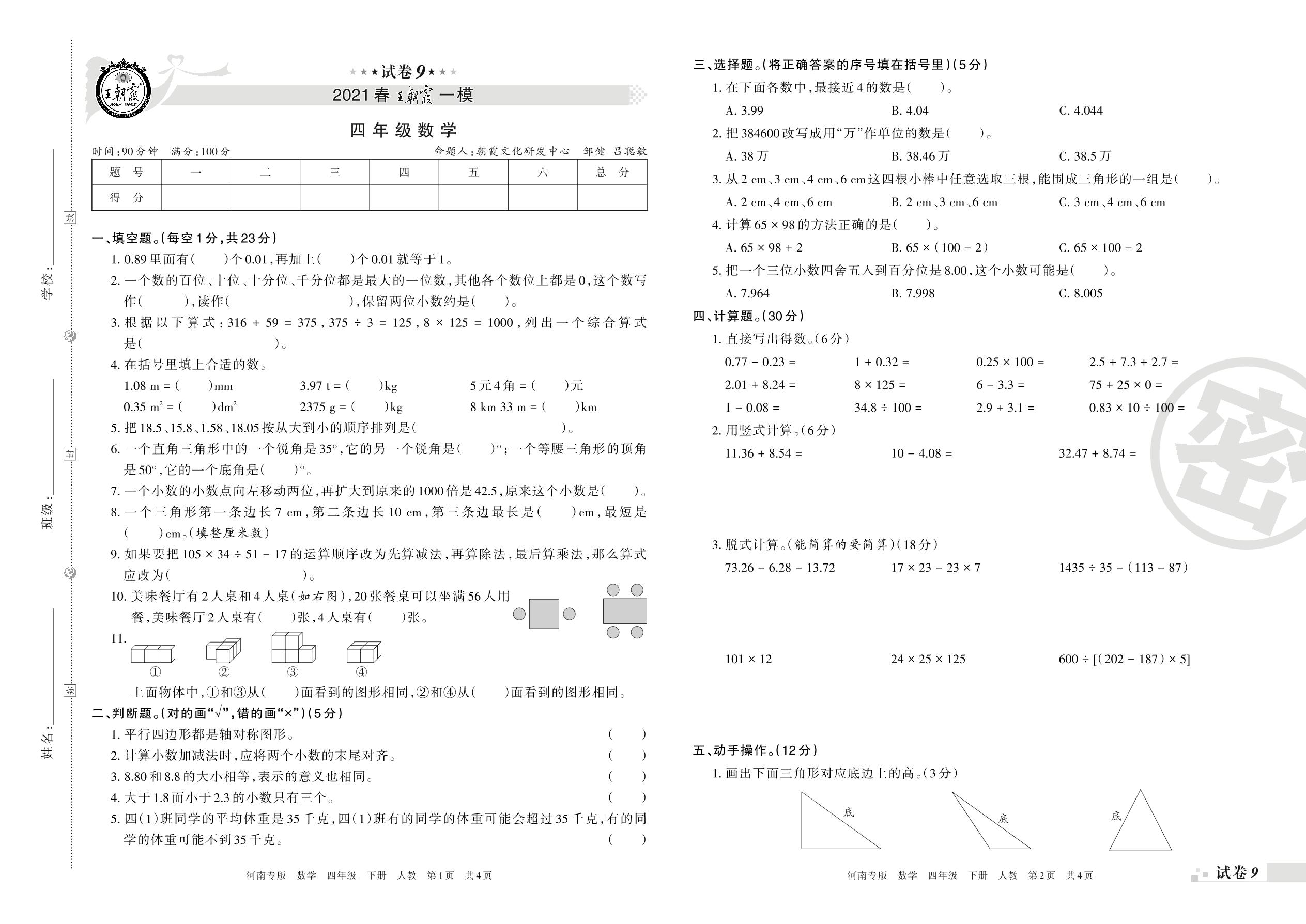 王朝霞期末模拟卷四年级下册数学(人教版)_R210804135548【9】