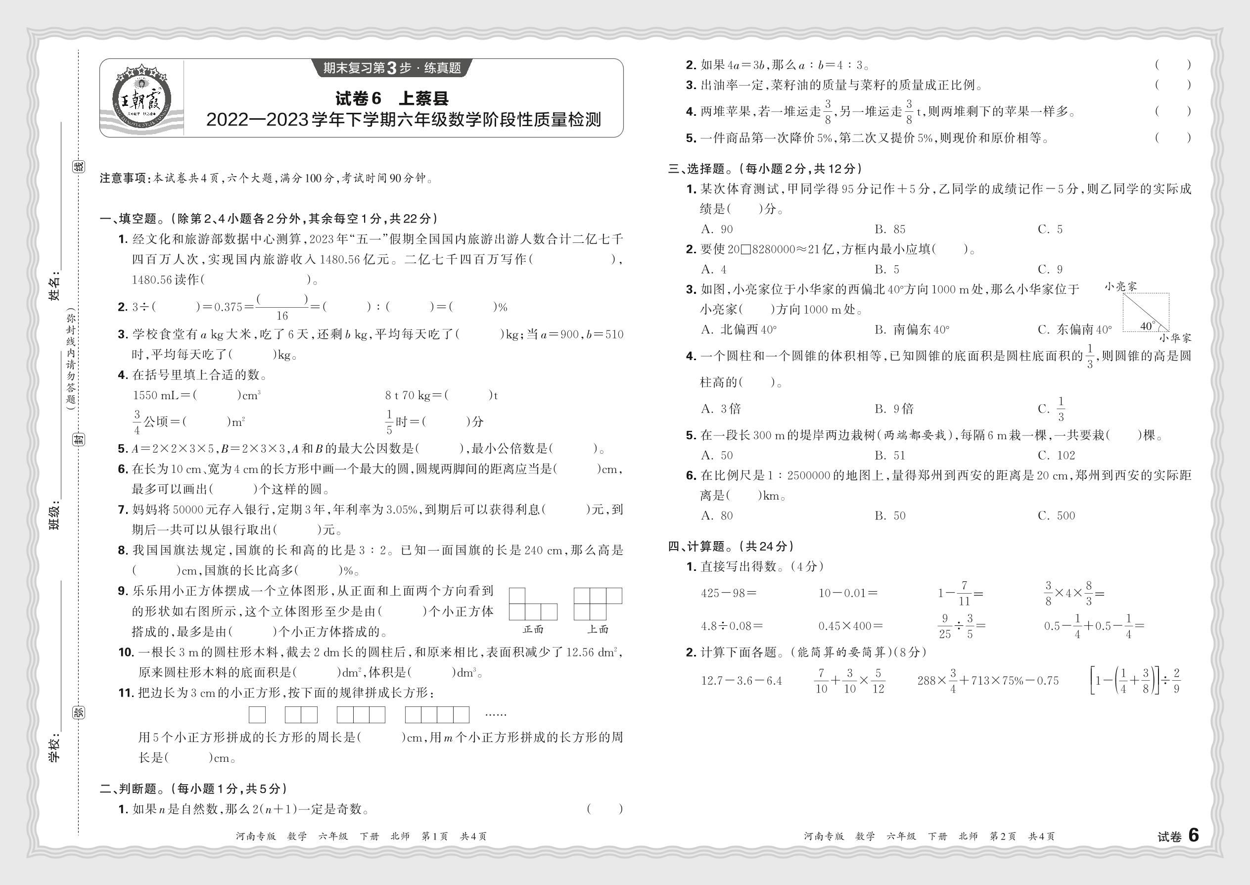 河南省驻马店市上蔡县2022—2023学年下学期六年级数学阶段性质量检测(北师版)【6】