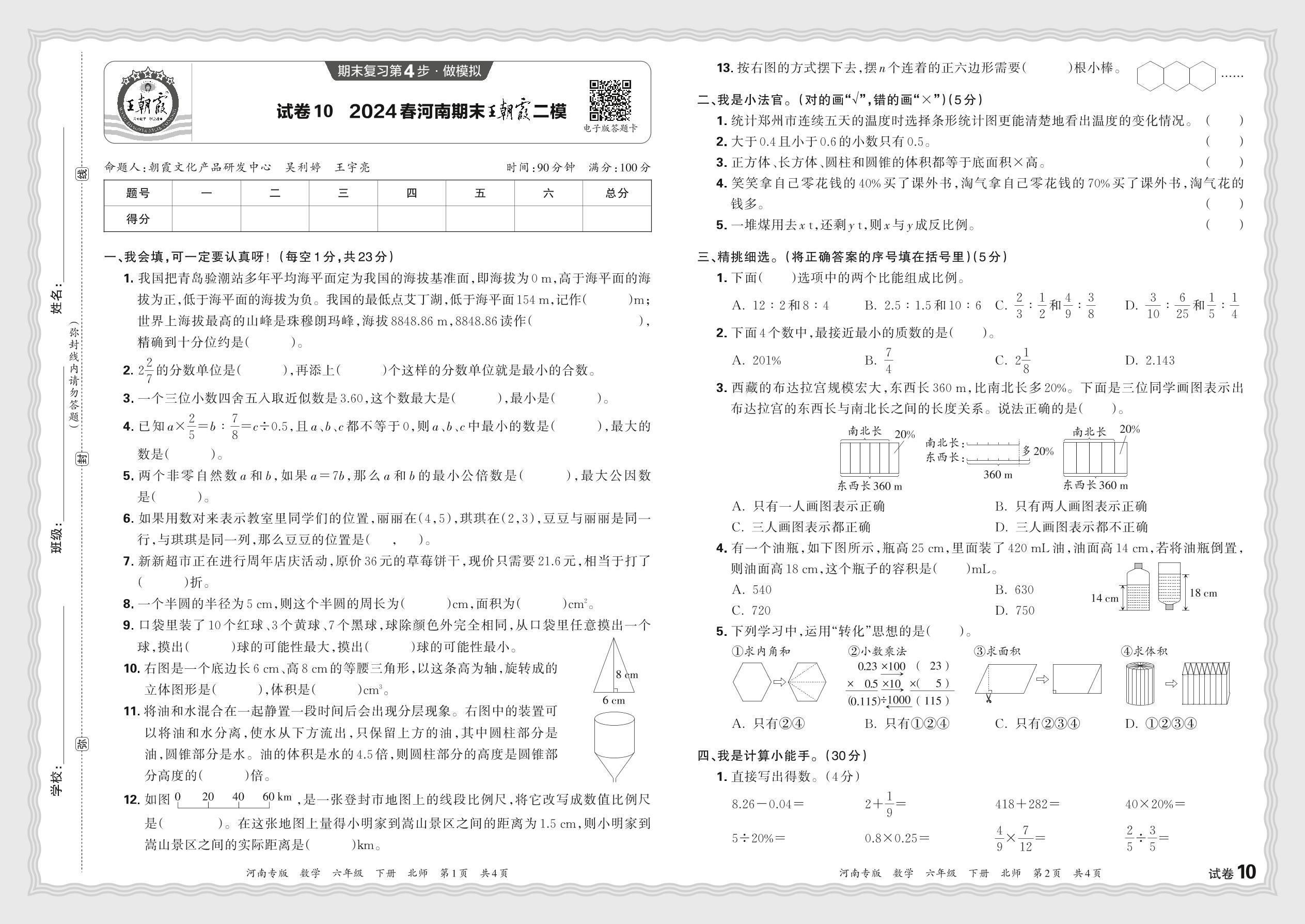 2024春下册六年级数学北师版 河南期末王朝霞二模