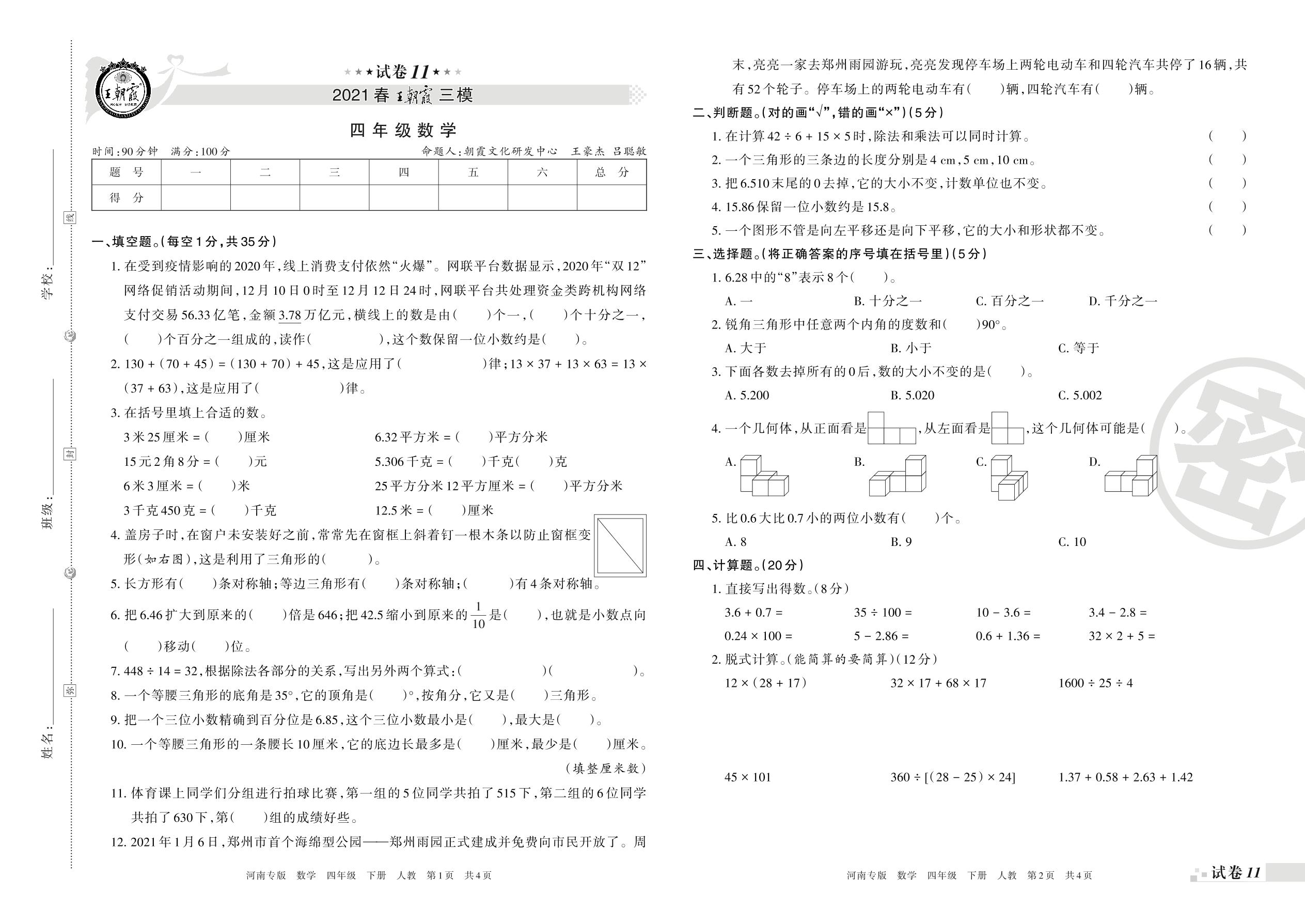 王朝霞期末模拟卷四年级下册数学(人教版)_R210804135556【11】