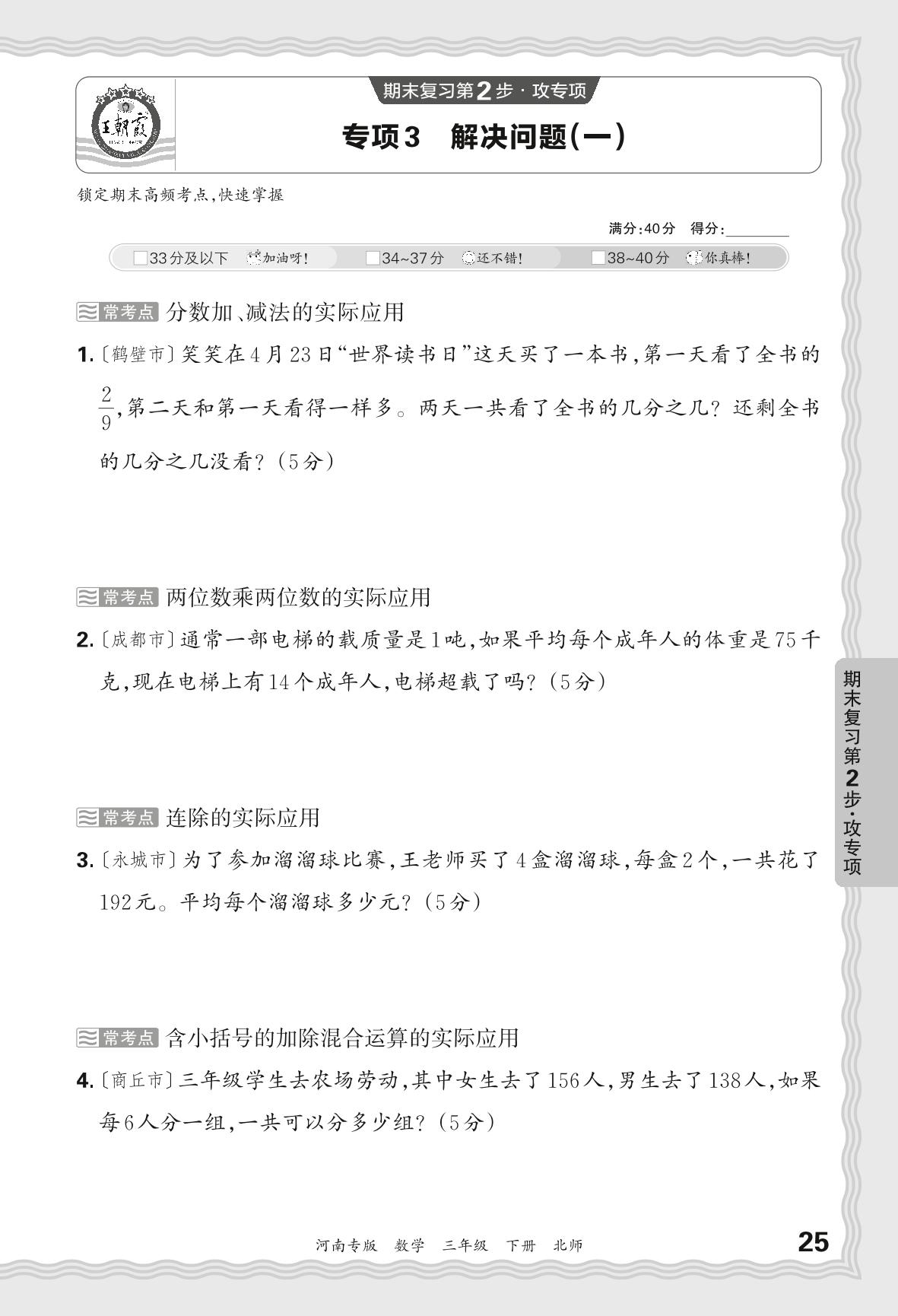 2024春下册三年级数学北师版 期末专项卷河南版·解决问题(一)【3】