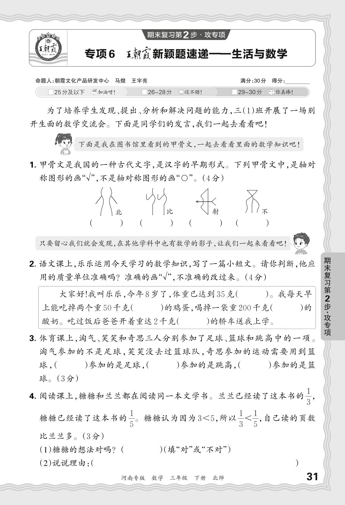 2024春下册三年级数学北师版 期末专项卷河南版·王朝霞新颖题速递——生活与数学【6】