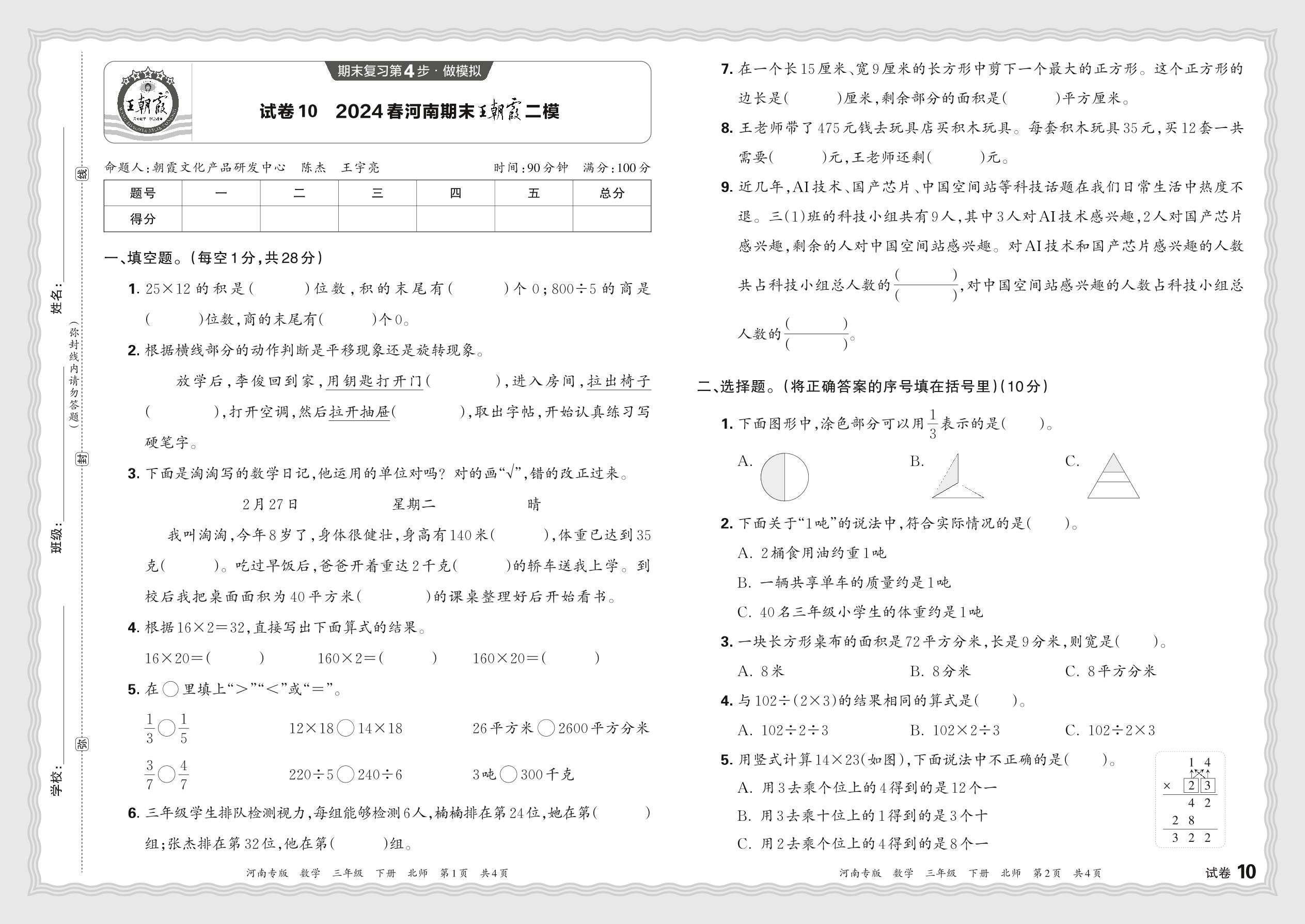 2024春下册三年级数学北师版 河南期末王朝霞二模