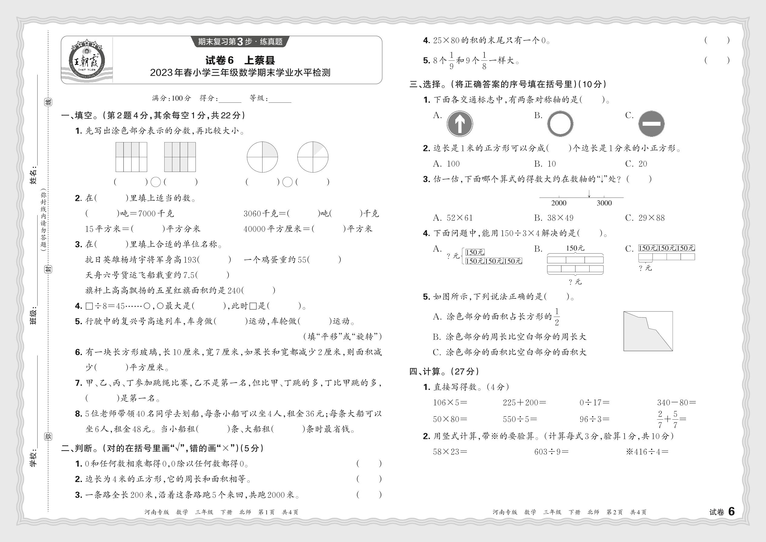 河南省驻马店市上蔡县2023年春小学三年级数学期末学业水平检测(北师版)【6】