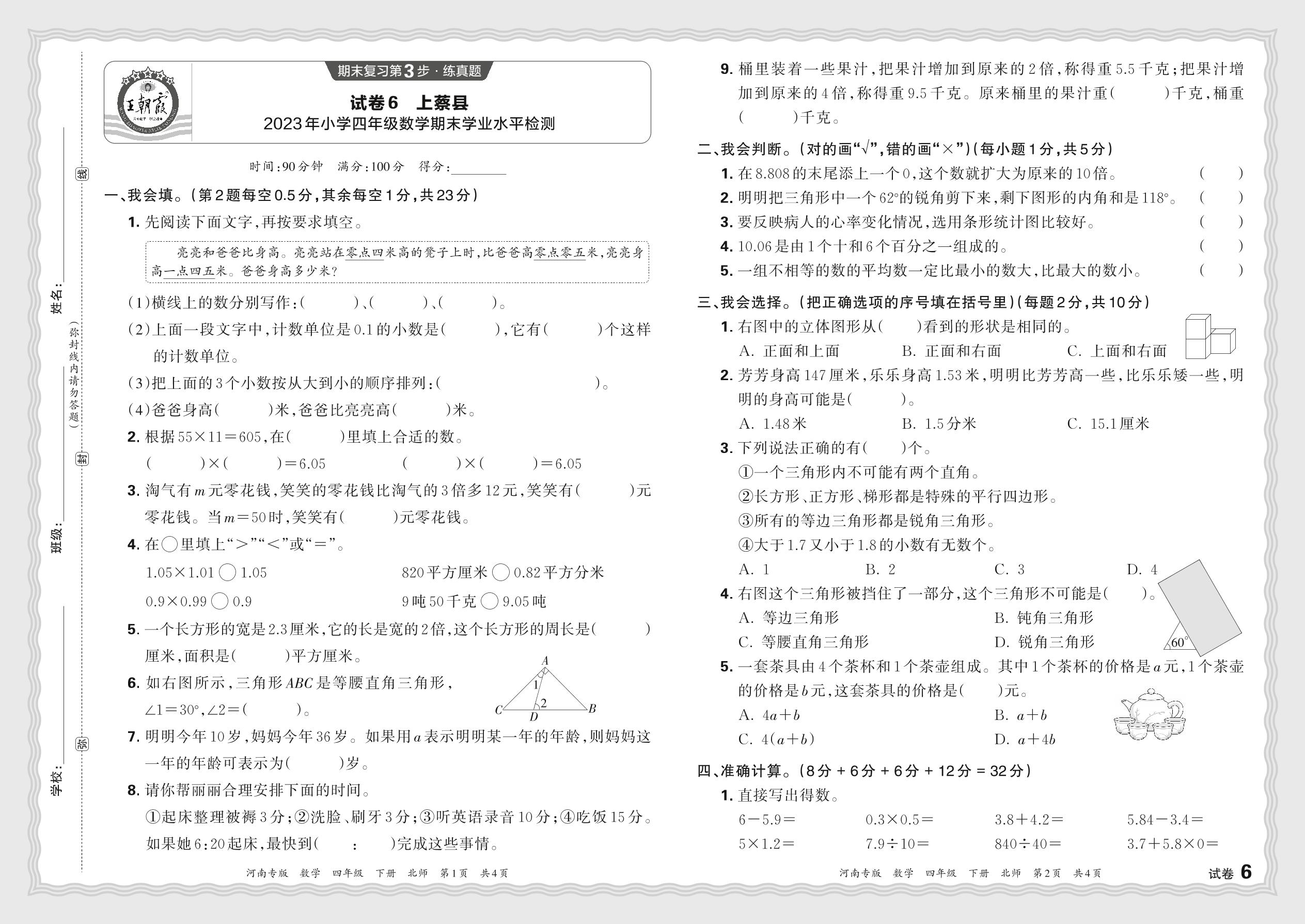 河南省驻马店市上蔡县2023年春小学四年级数学期末学业水平检测(北师版)【6】