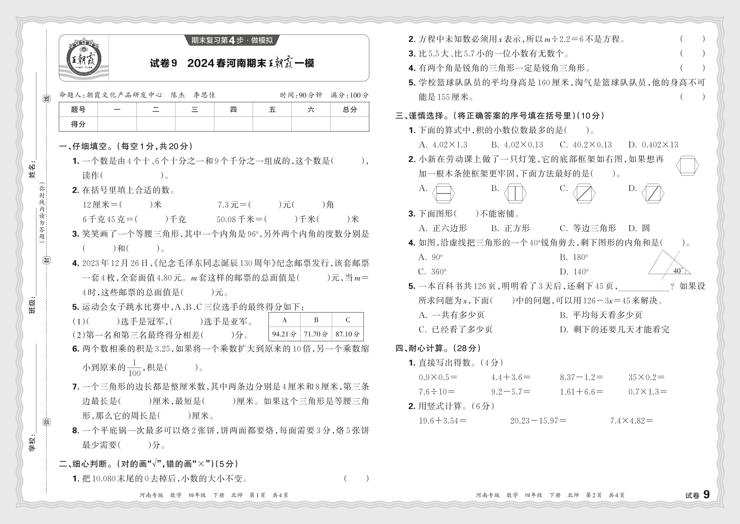 2024春下册四年级数学北师版 河南期末王朝霞一模
