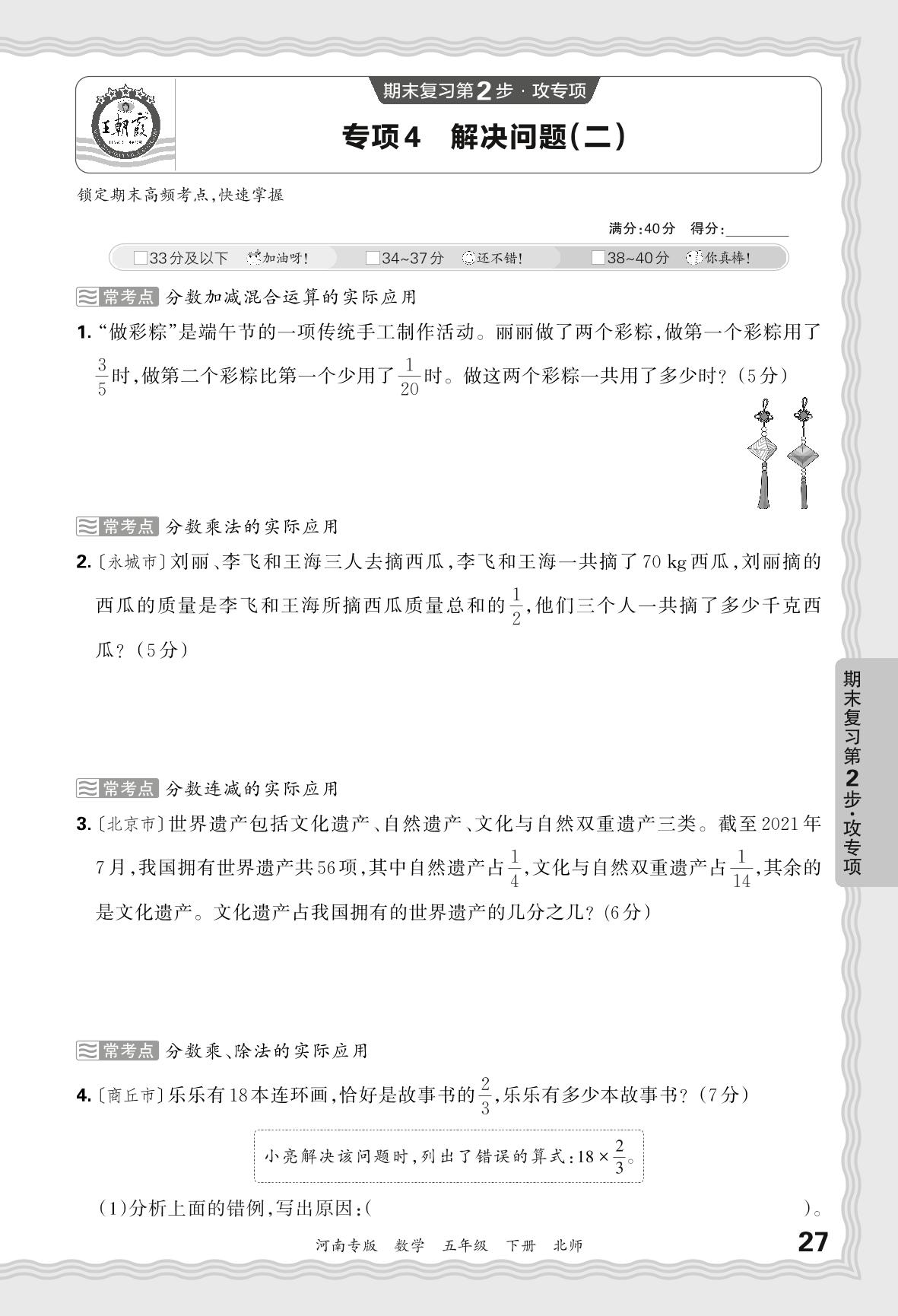 2024春下册五年级数学北师版 期末专项卷河南版·解决问题(二)