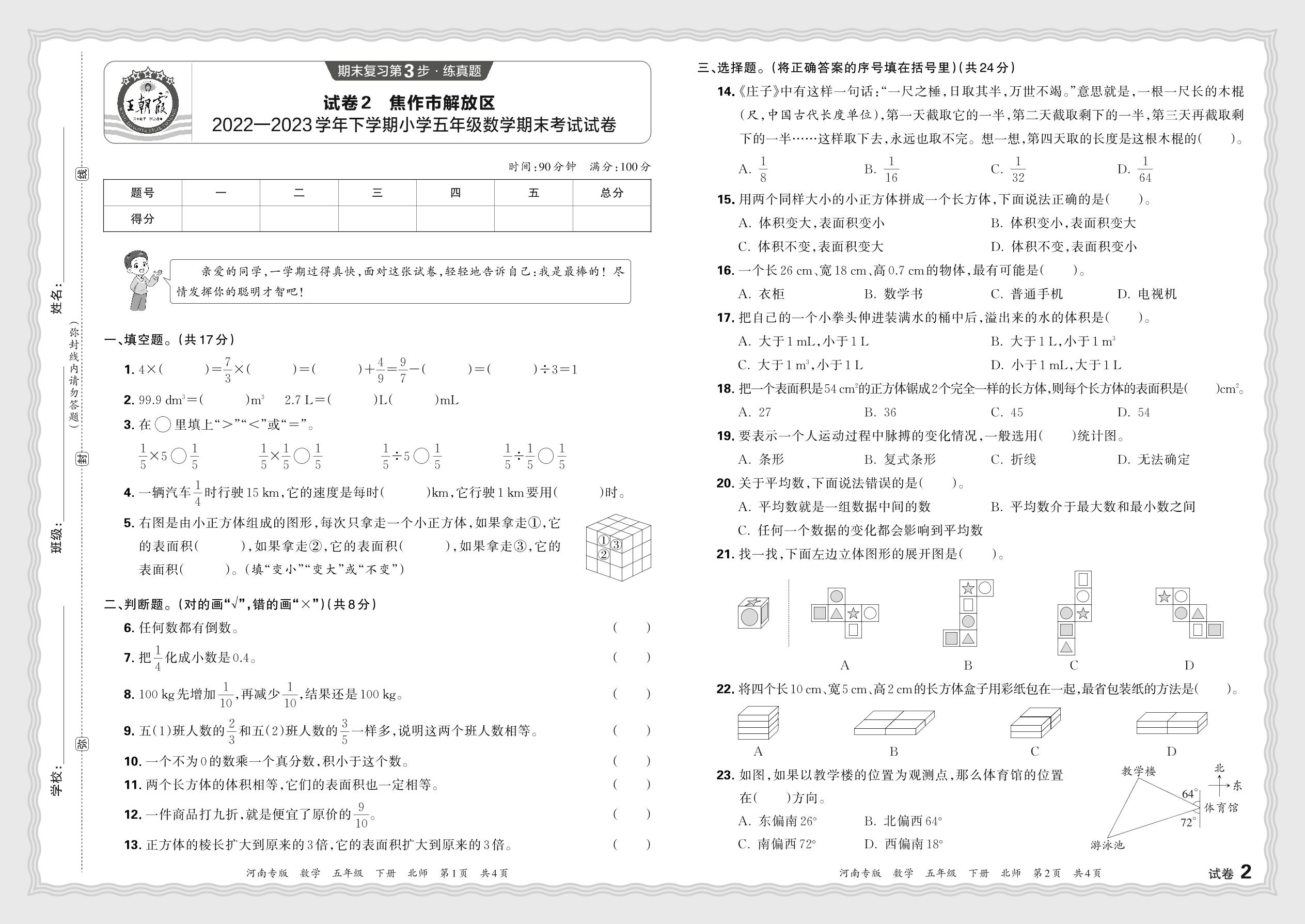 河南省焦作市解放区2022—2023学年下学期小学五年级数学期末考试试卷(北师版)【2】