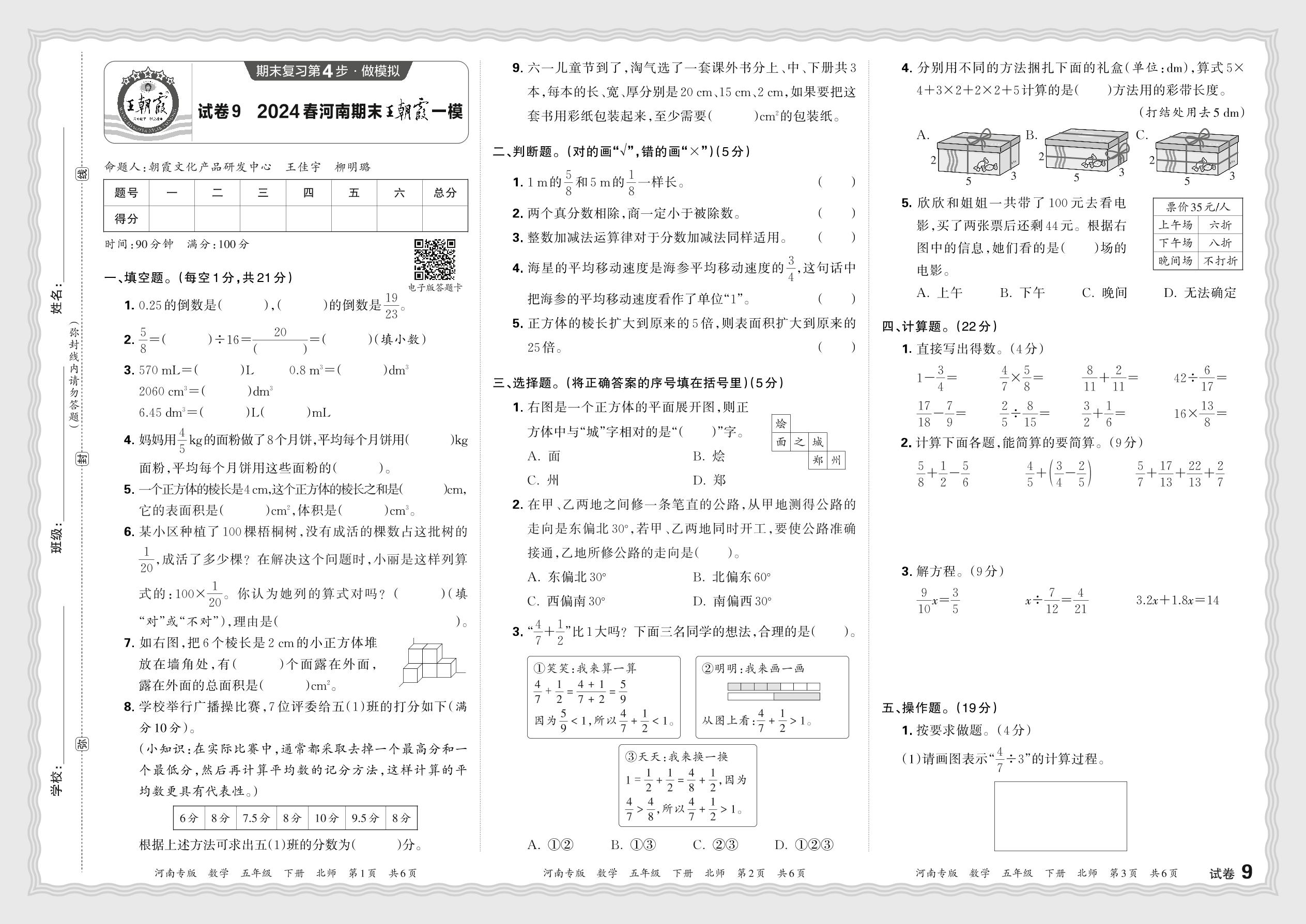 2024春下册五年级数学北师版 河南期末王朝霞一模