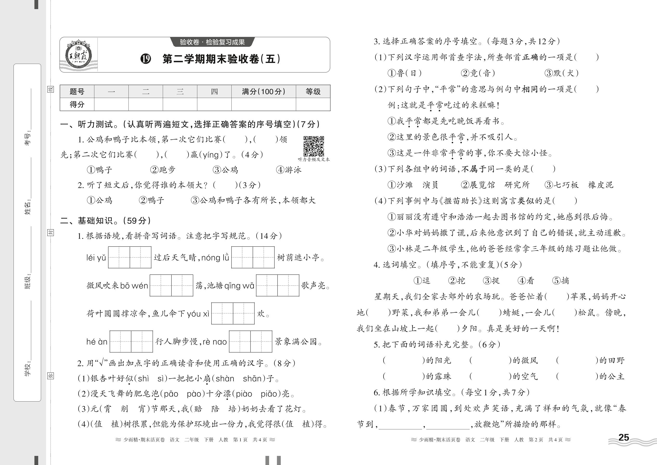 2024春下册二年级语文人教版 第二学期期末真题验收卷(五)