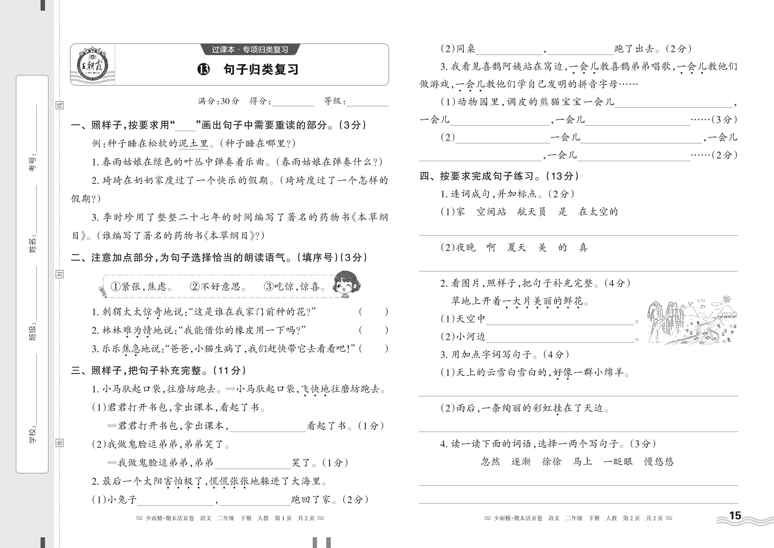 2024春下册二年级语文人教版 期末过课本HY版·句子归类复习