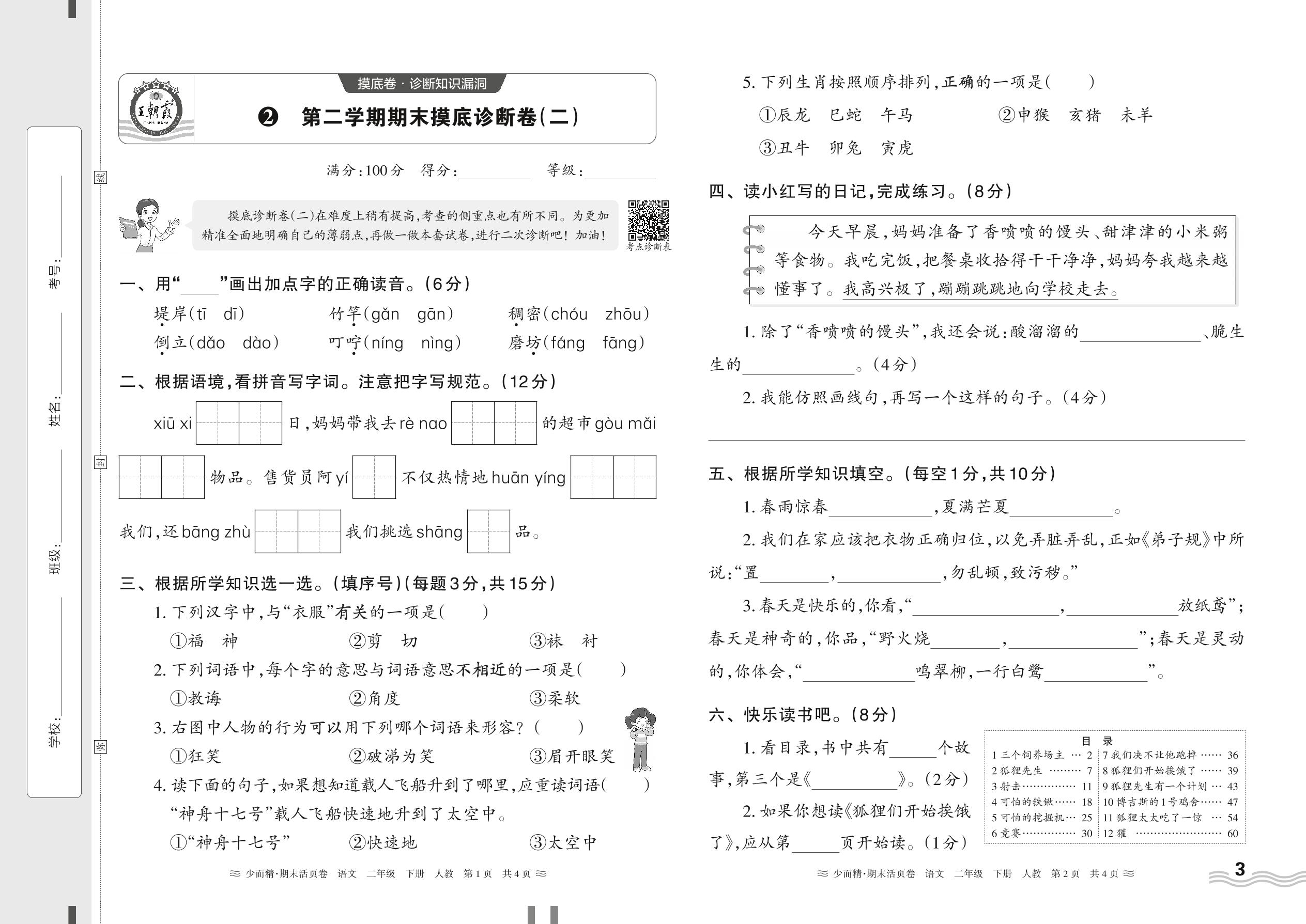 2024春下册二年级语文人教版 第二学期期末摸底诊断卷(二)