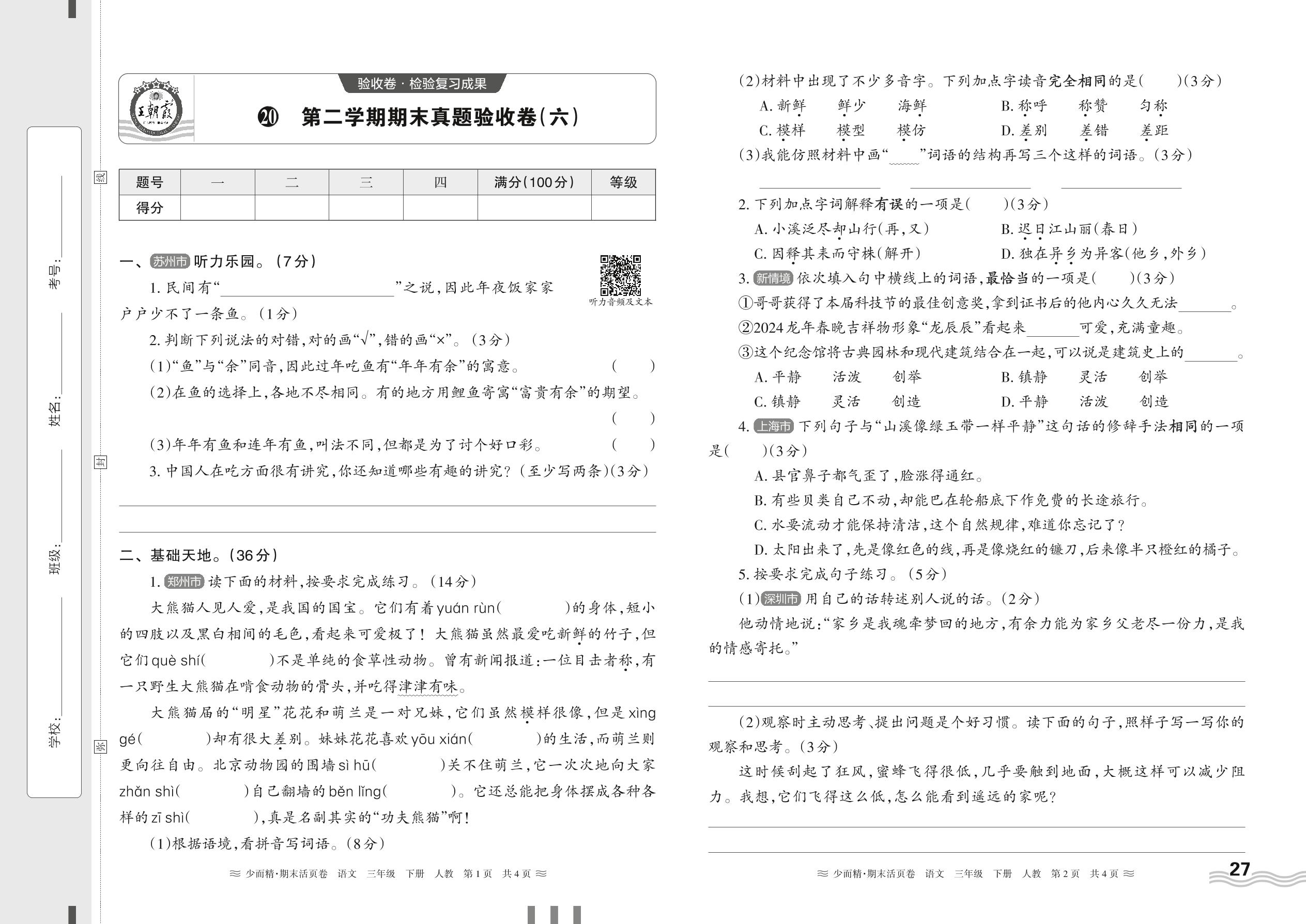 2024春下册三年级语文人教版 第二学期期末真题验收卷(六)