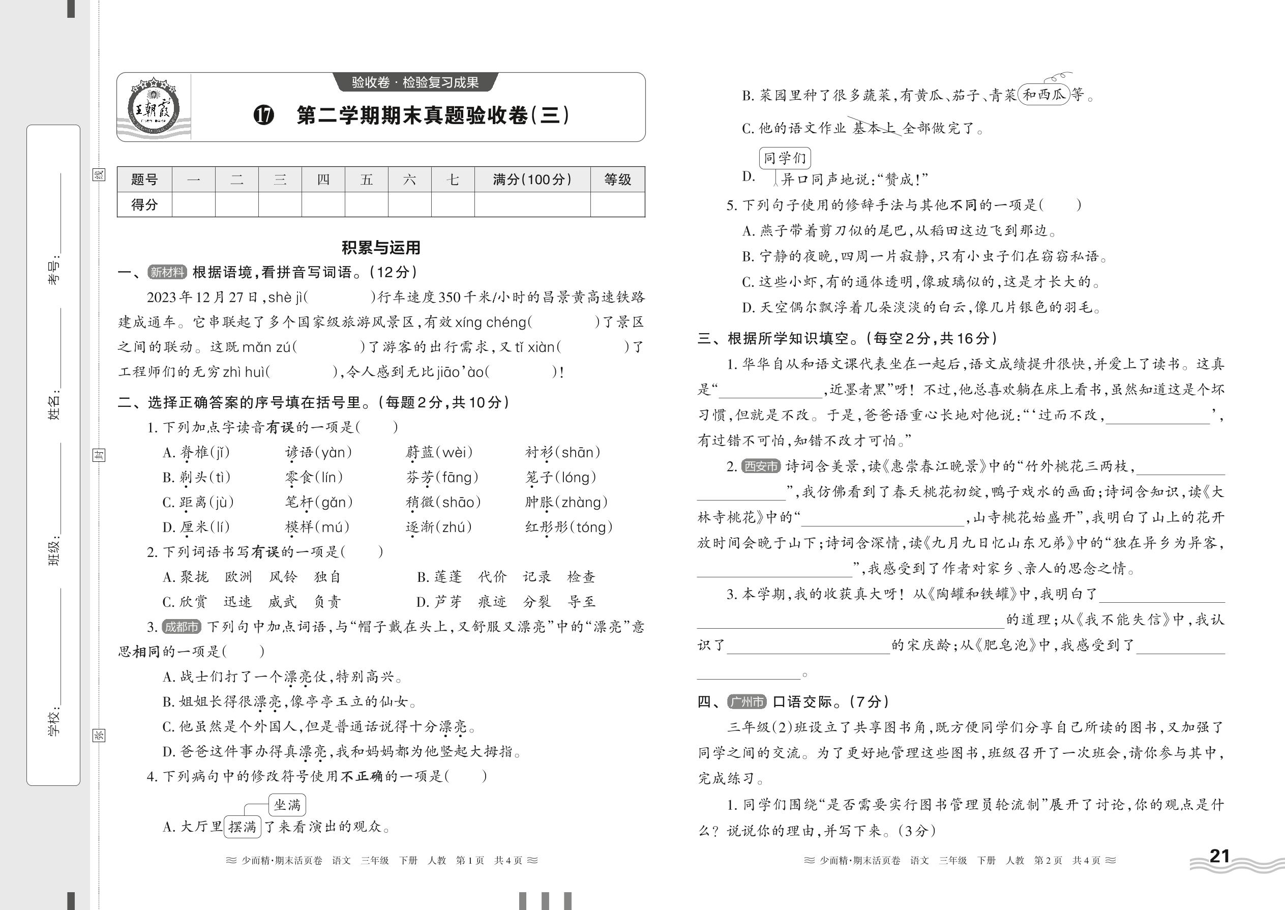 2024春下册三年级语文人教版 第二学期期末真题验收卷(三)