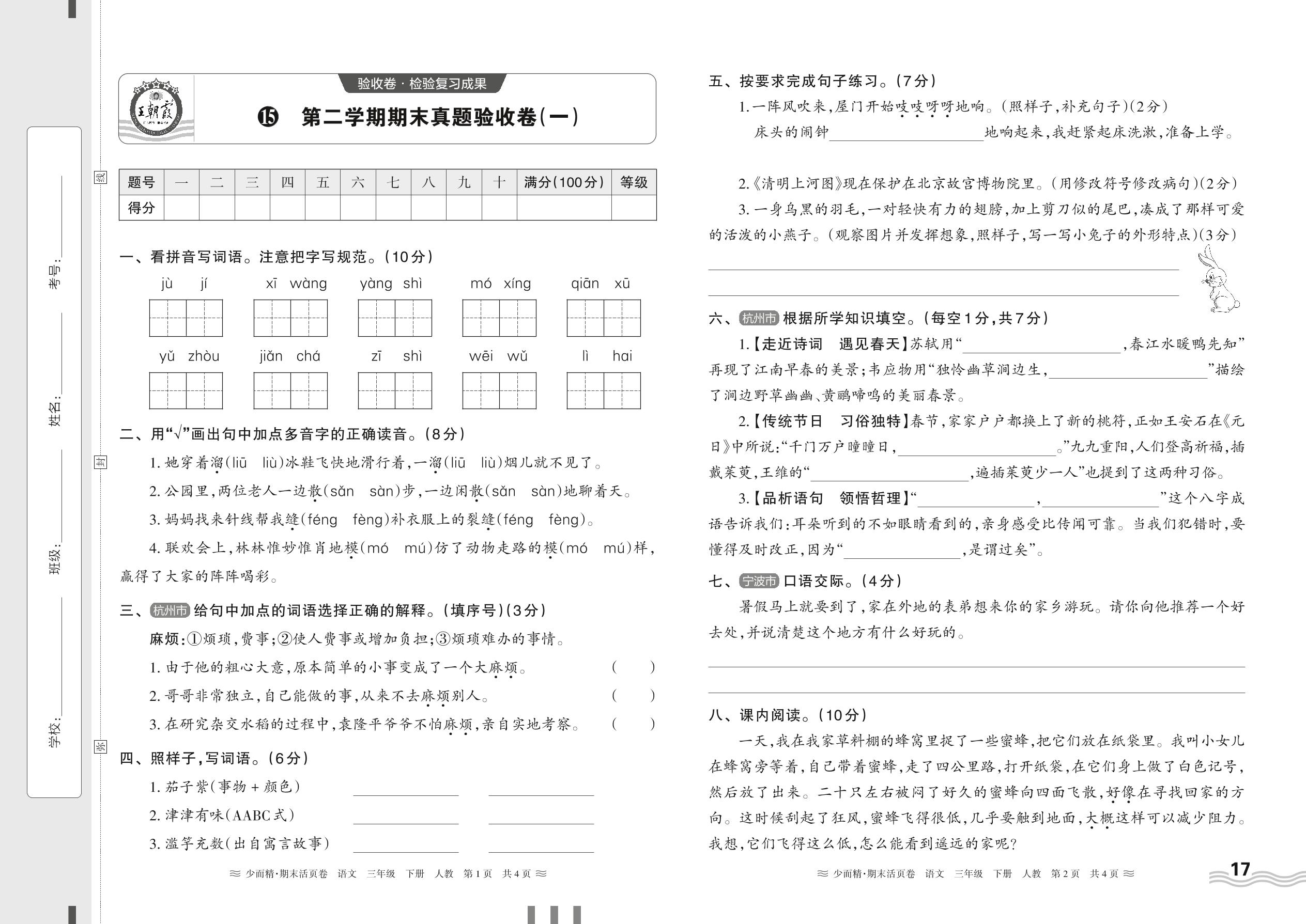 2024春下册三年级语文人教版 第二学期期末真题验收卷(一)