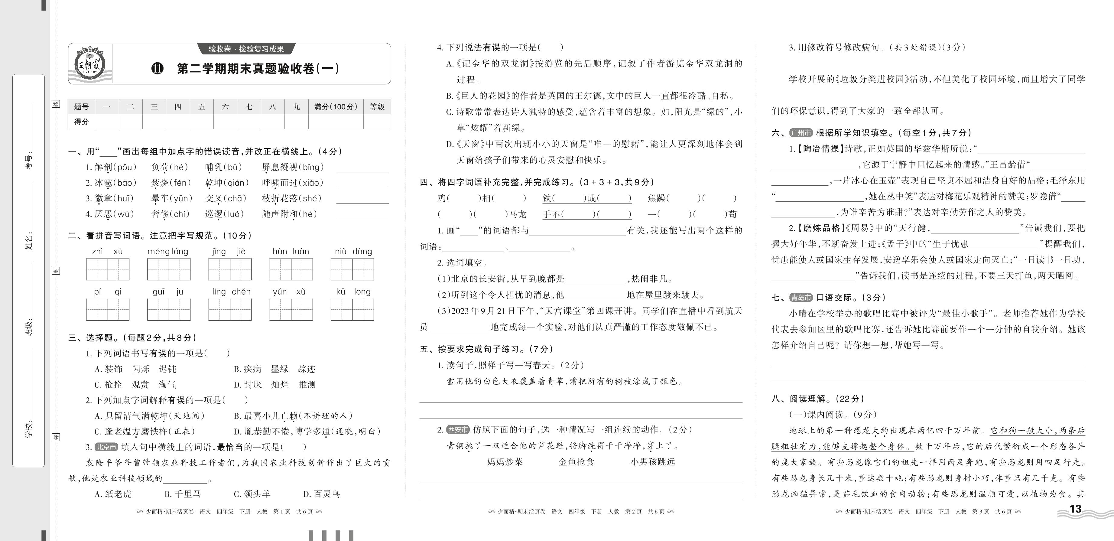 2024春下册四年级语文人教版 第二学期期末真题验收卷(一)