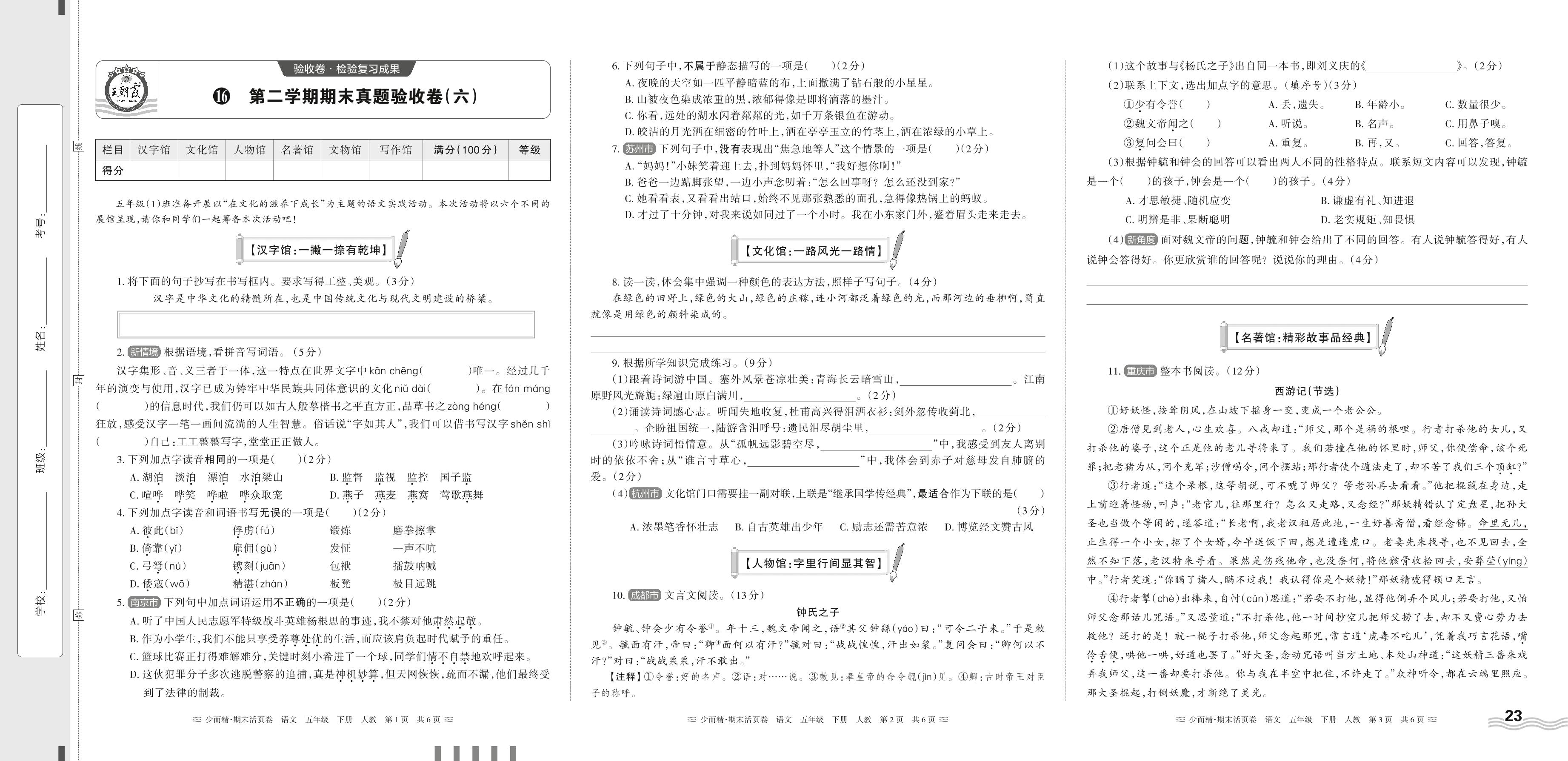2024春下册五年级语文人教版 第二学期期末真题验收卷(六)