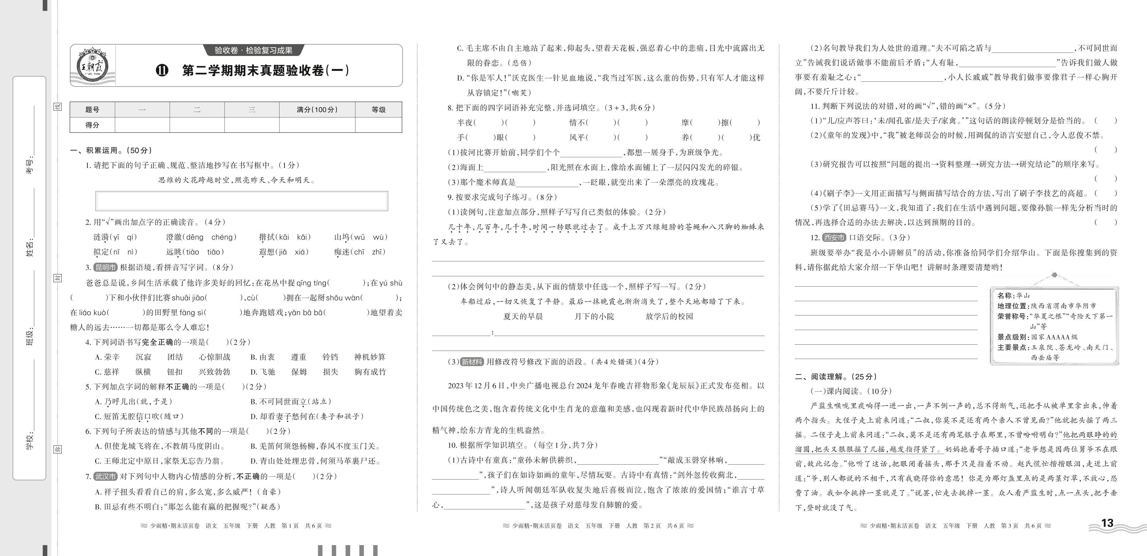 2024春下册五年级语文人教版 第二学期期末真题验收卷(一)