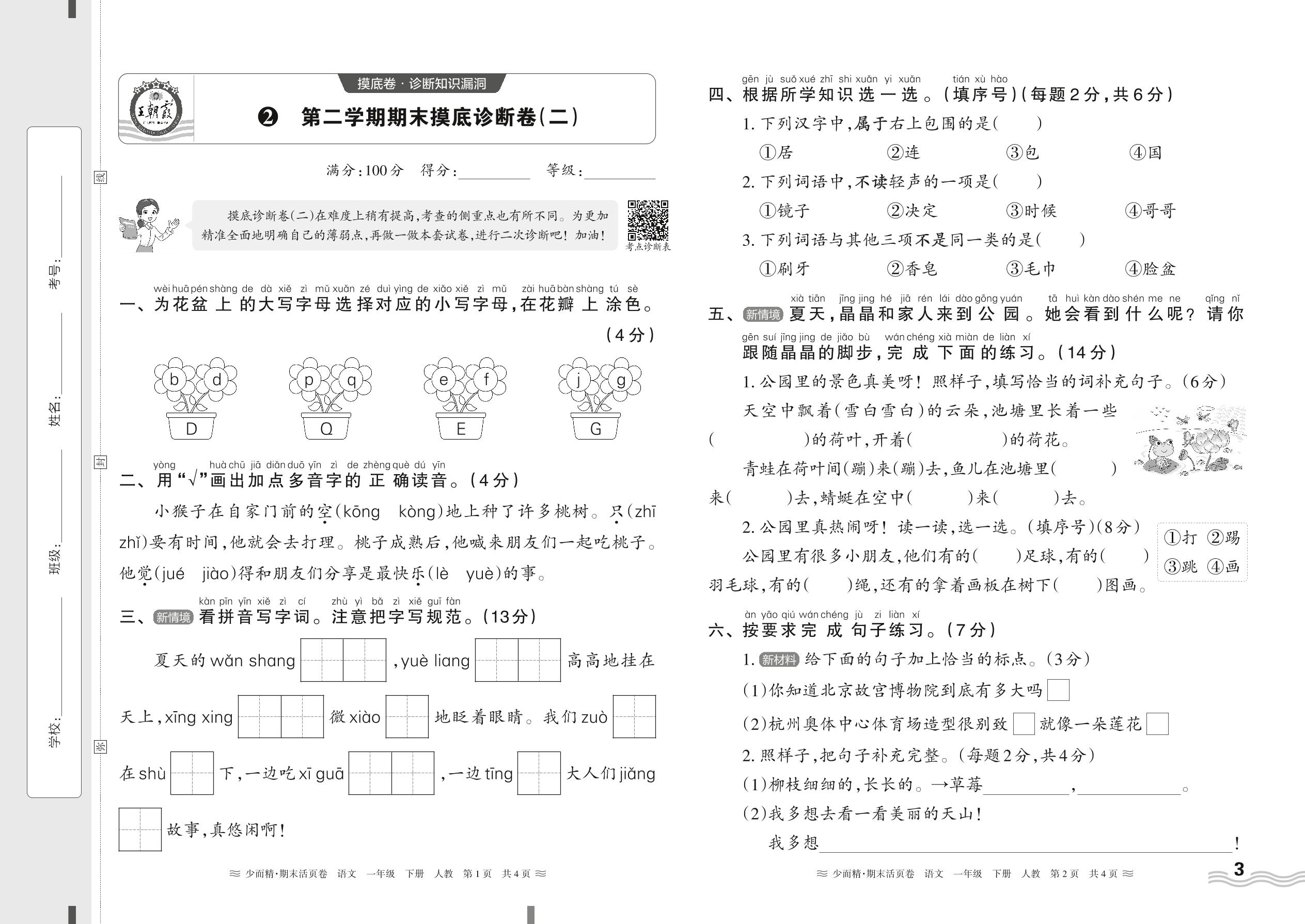 2024春下册一年级语文人教版 第二学期期末摸底诊断卷(二)