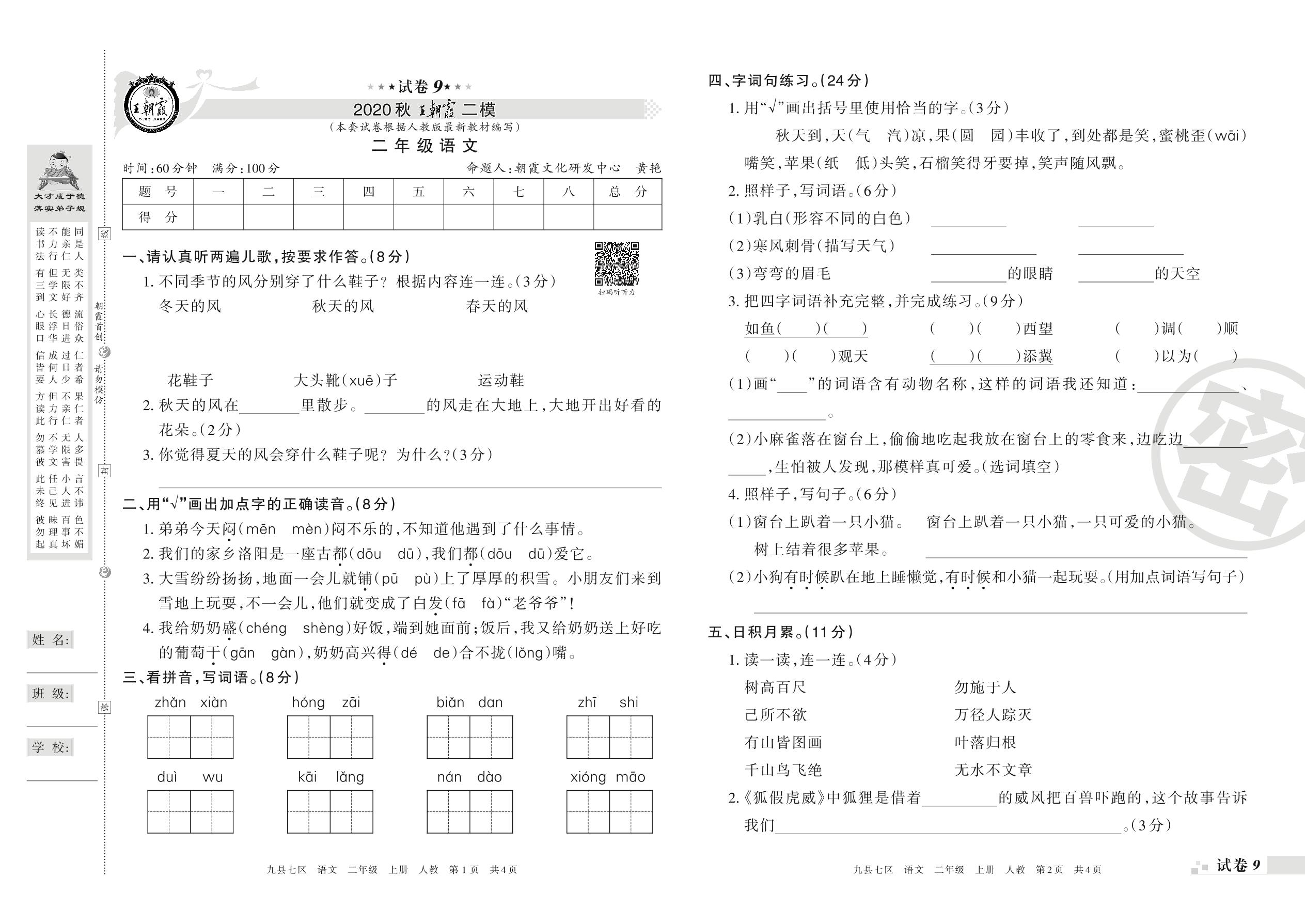 王朝霞期末模拟卷二年级上册语文(人教版)【9】