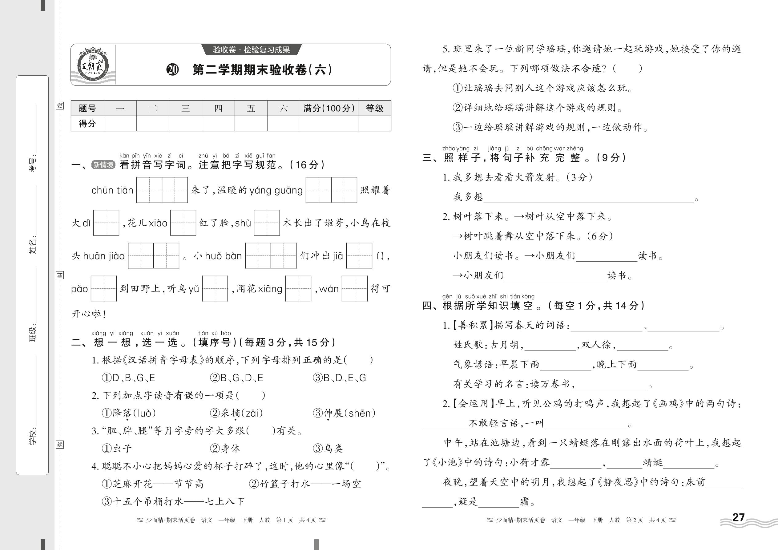 2024春下册一年级语文人教版 第二学期期末验收卷(六)