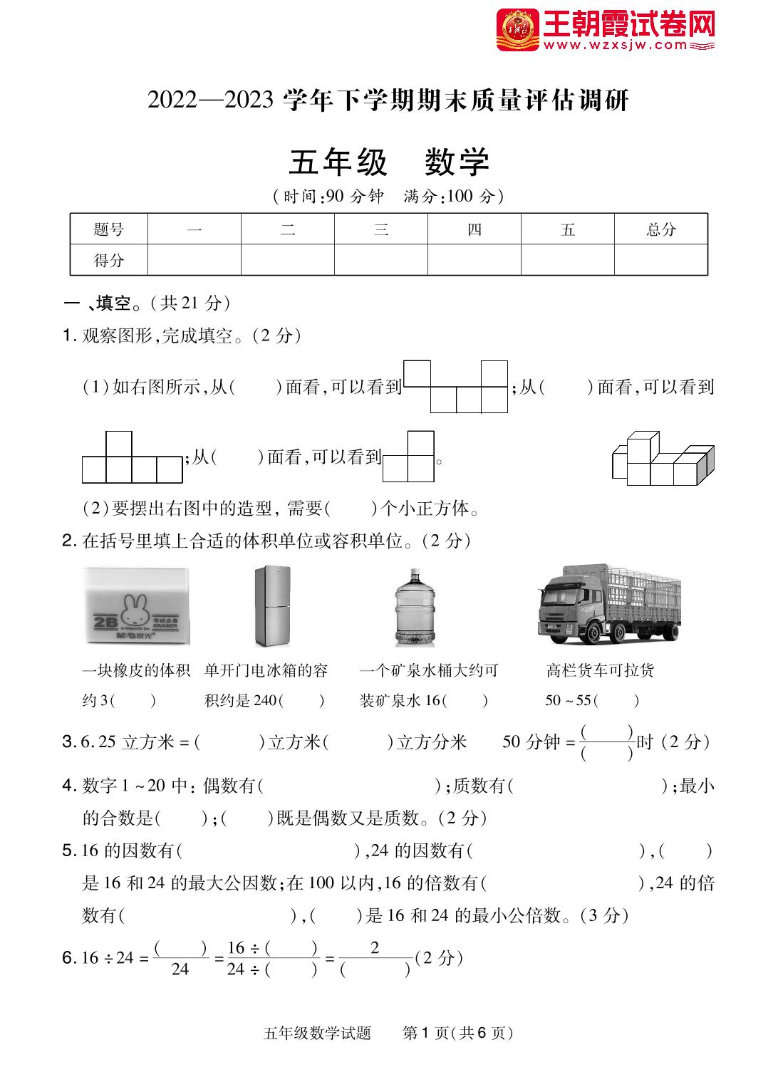 五年级数学人教版下册期末卷