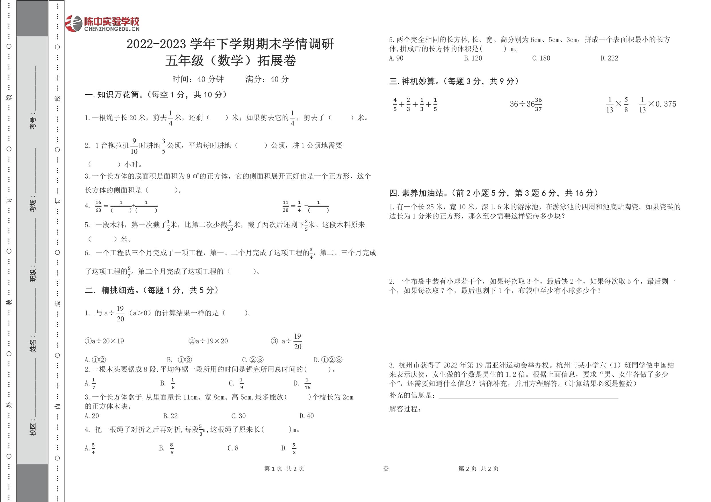 河南省郑州陈中实验学校2022—2023学年下学期期末学期调研拓展卷五年级数学(北师版)