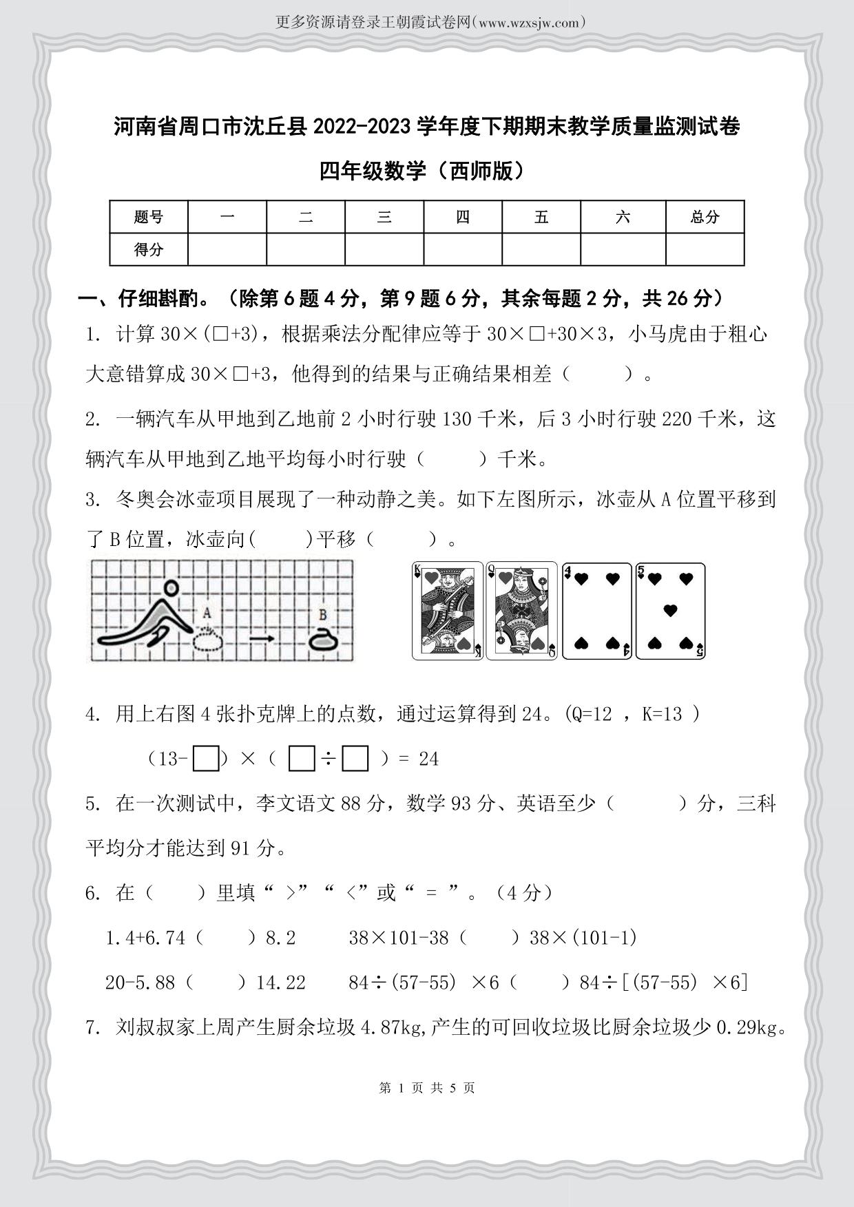 河南省周口市沈丘县2022—2023学年下学期期末教学质量监测试题四年级数学(西师版)