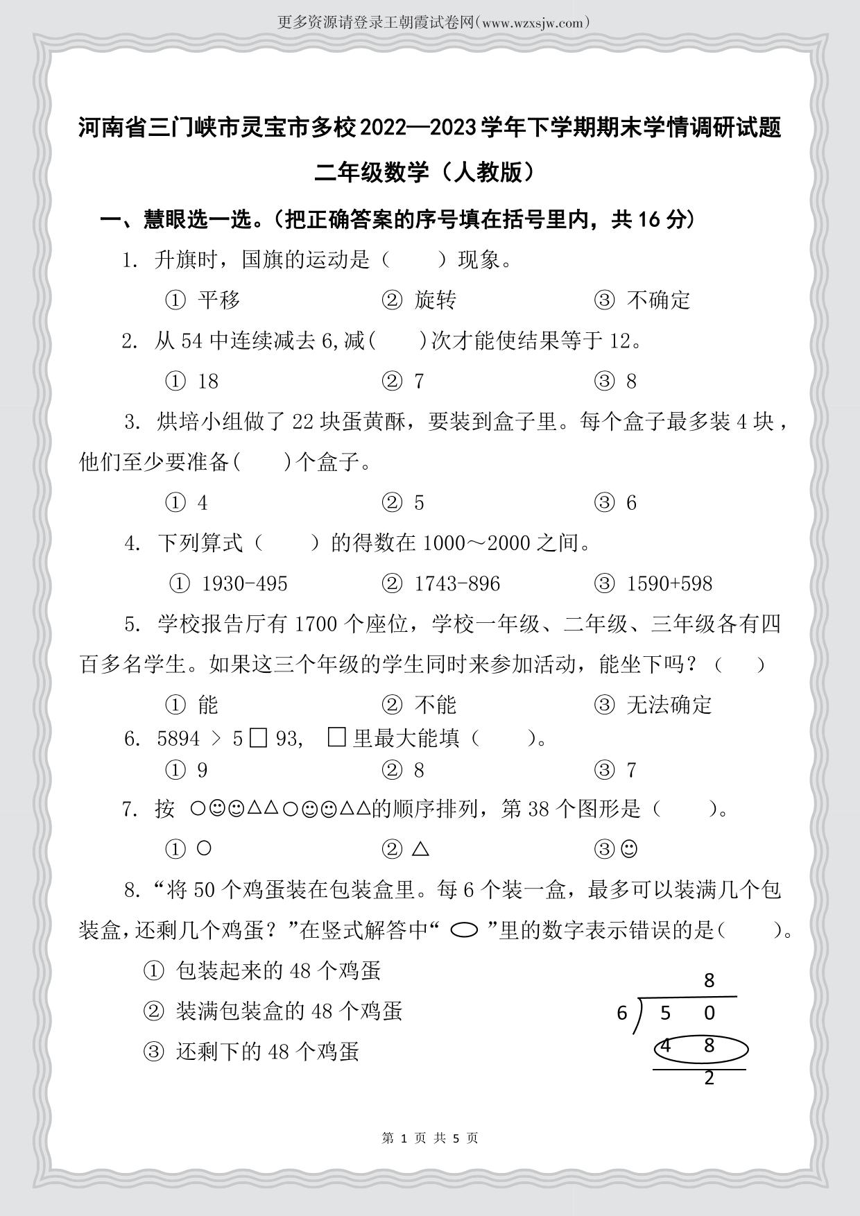 河南省三门峡市灵宝市2022—2023学年下学期期末学情调研试题二年级数学(人教版)