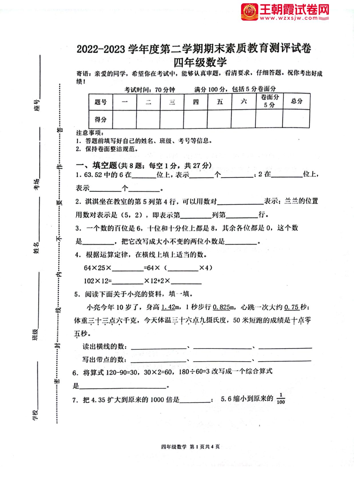 河南省周口市项城市2022—2023学年下学期期末素质教育测评试卷四年级数学(西师版)