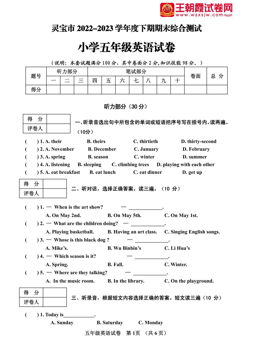 河南省三门峡市灵宝市2022—2023学年下学期期末综合测试五年级英语(人教PEP版)【无听力音频】