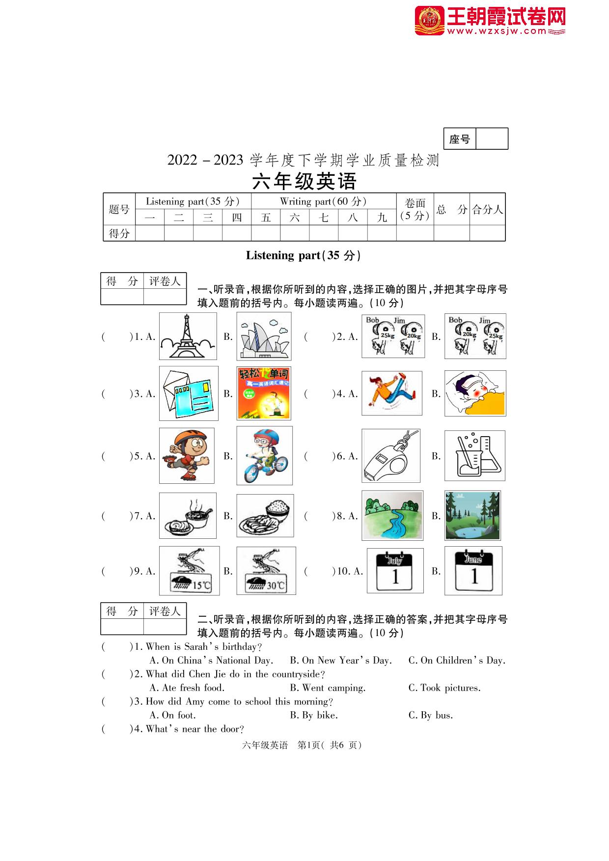 六年级英语人教PEP版(三起始)下册期末卷