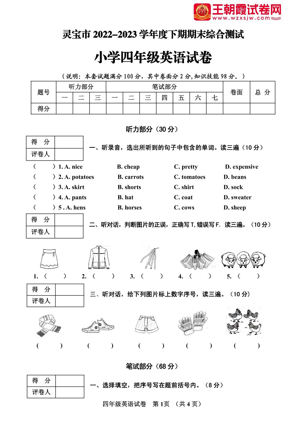 河南省三门峡市灵宝市2022—2023学年下学期期末综合测试四年级英语(人教PEP版)【无听力音频】